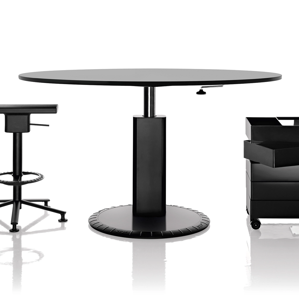 Table. Adjustable in height. Material: base in die-cast aluminium, frame in aluminium, crosspiece in steel. Top in steel electro-galvanized and painted in polyester powder.