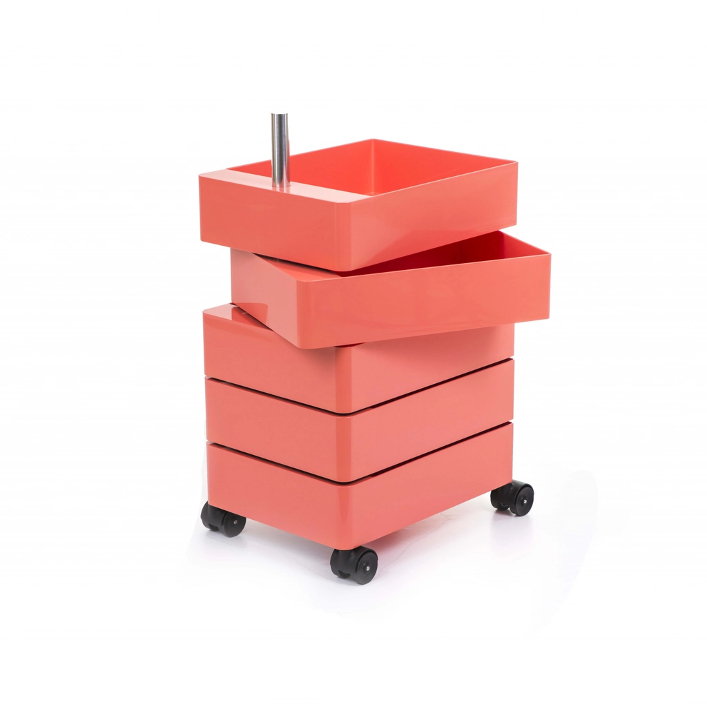 Drawer unit on wheels. Material: glossy ABS including one tray. Joining tube in stainless steel. Available in two heights.