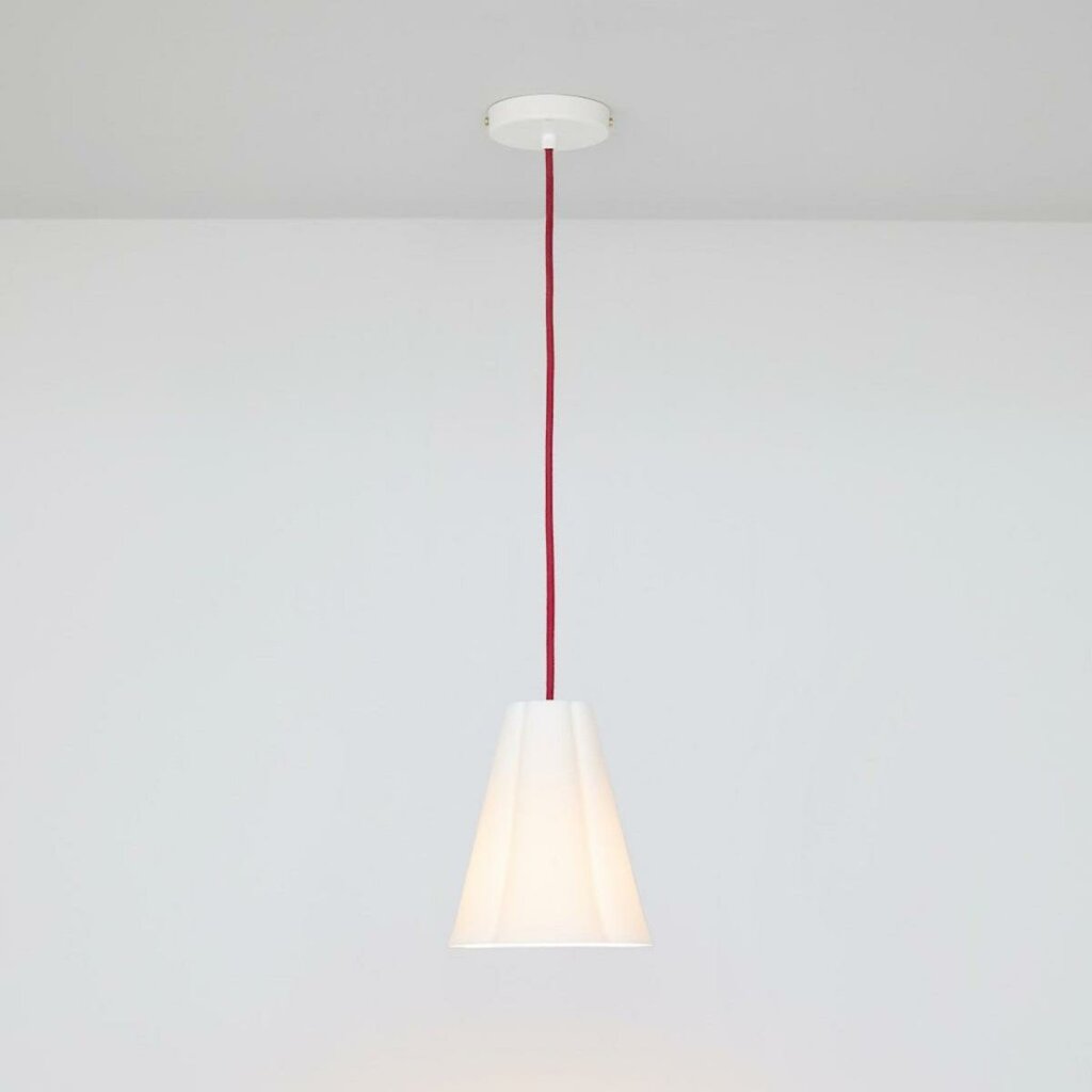 Floral inspirations meet fine lines: the Blossom Pendants elegantly enhance rooms, providing functional as well as indirect lighting. Inspired by the Plum blossom, the design of the handmade bone china shade combines poetic details with a clean, sculptural presence. From its petal-shaped top, it gently tapers out, casting a circle of light below. When switched on, the glossy shade turns translucent, gently glowing in the air. Available in two sizes, the Blossoms pendants are perfect above a kitchen counter, dining table, or entry hall. The fixture excites with a vivid red braided cotton cable or offers a more subdued look with the grey flex option. The ceiling rose is made from powder-coated metal, which is secured with two brass screws. Read More