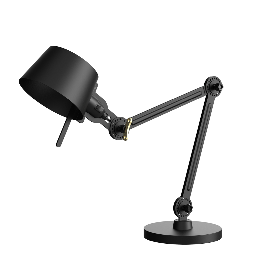 The Tonone Bolt Desk Small 2 arm foot is a design by Anton de Groof. The sturdy industrial lamp series BOLT is recognisable by functionality in shape, clean lines, and the iconic leading role of the wingnut. The Bolt series is available in 29 models. The desk lamp is characterised by the two adjustable powder-coated steel arms and an open shade made of powder-coated aluminium.