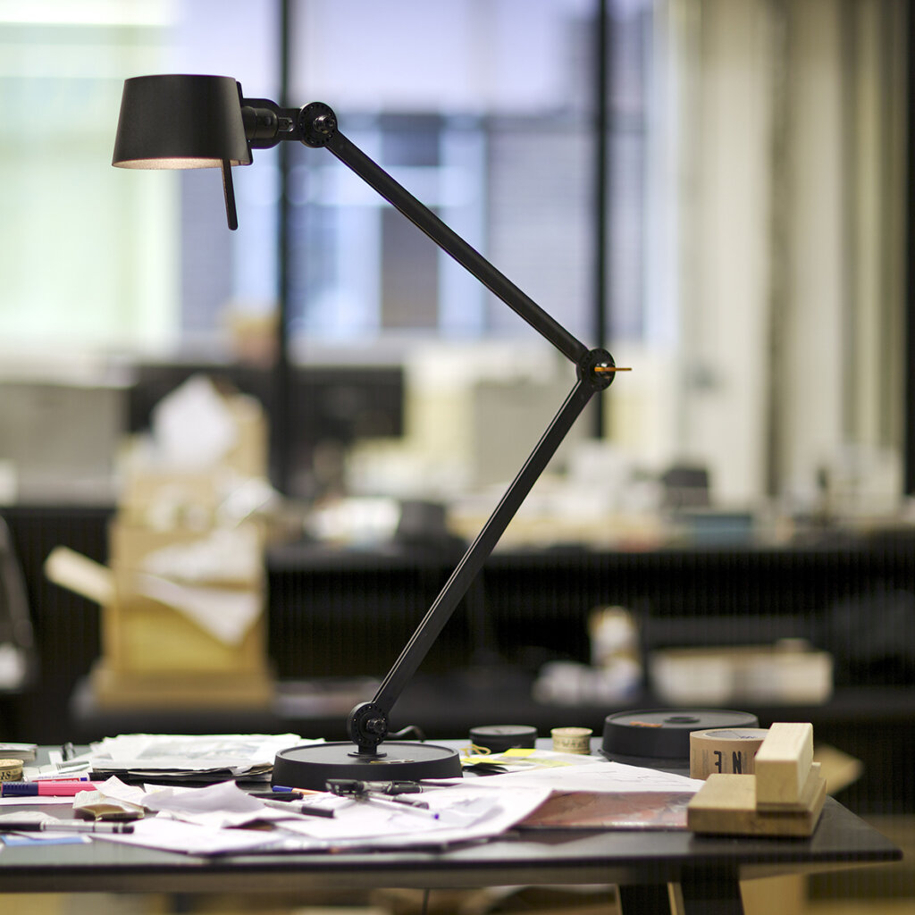 The Tonone Bolt Desk 2 arm foot is a design by Anton de Groof. The sturdy industrial lamp series BOLT is recognisable by functionality in shape, clean lines, and the iconic leading role of the wingnut. The Bolt series is available in 29 models. The desk lamp is characterised by the two adjustable powder-coated steel arms and an open shade made of powder-coated aluminium.