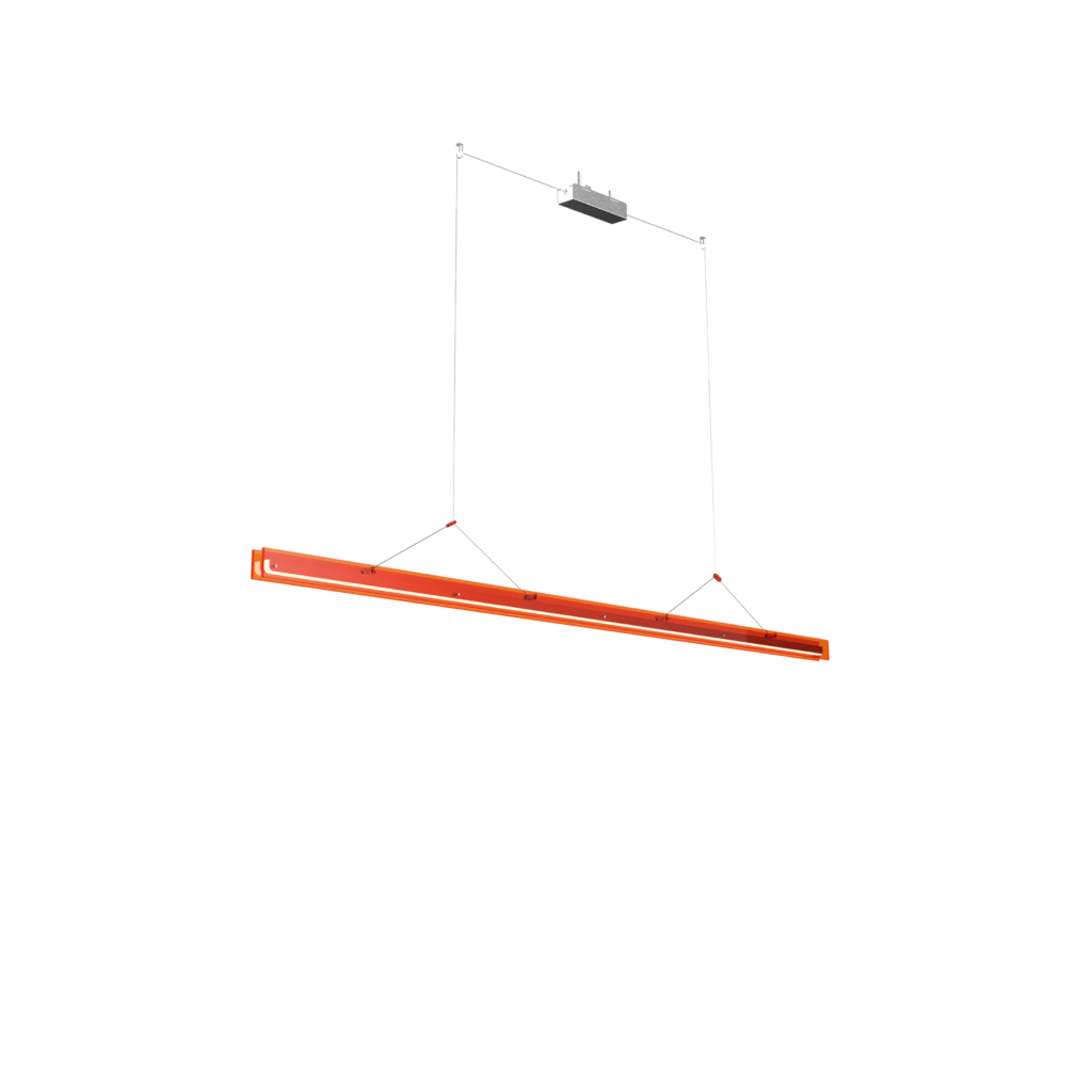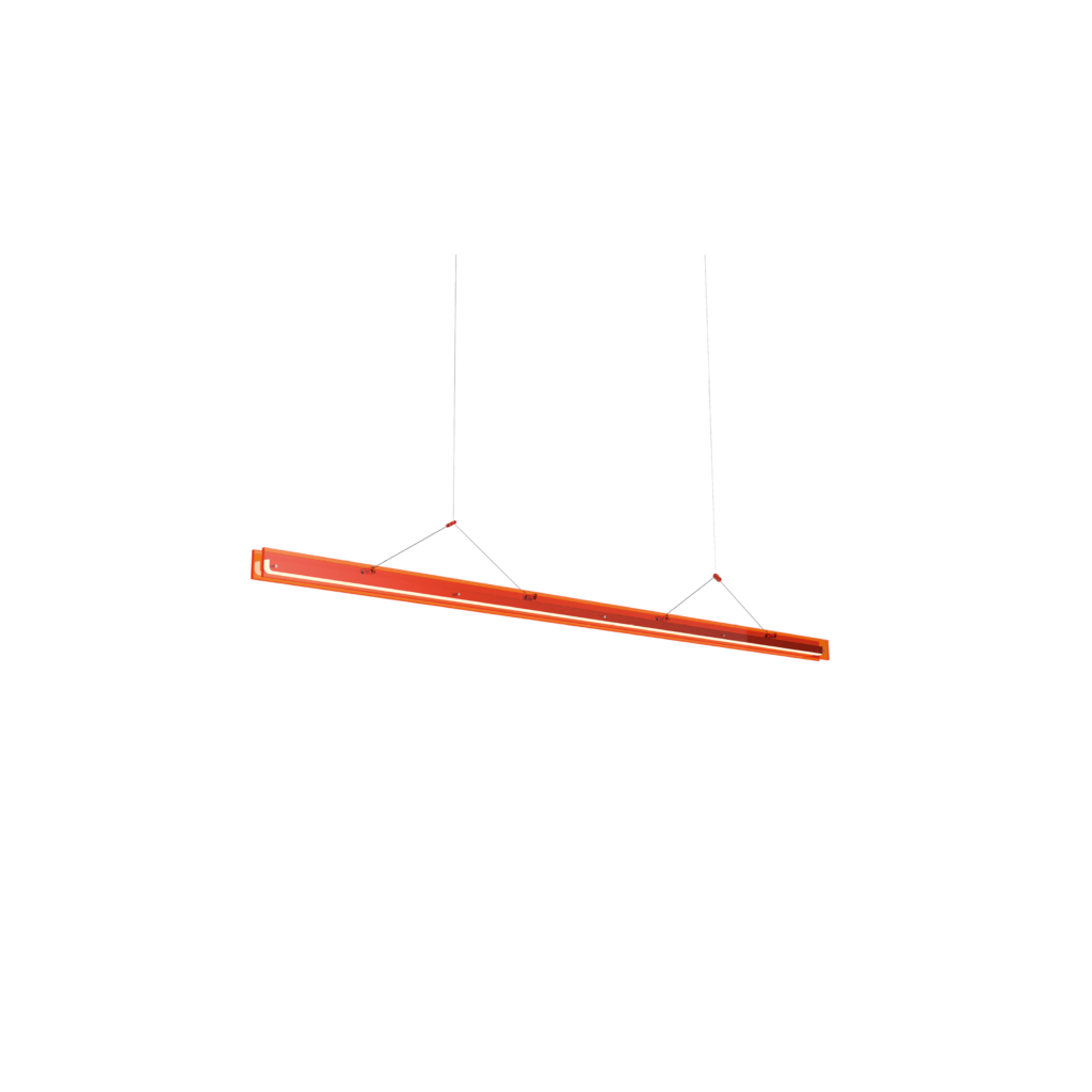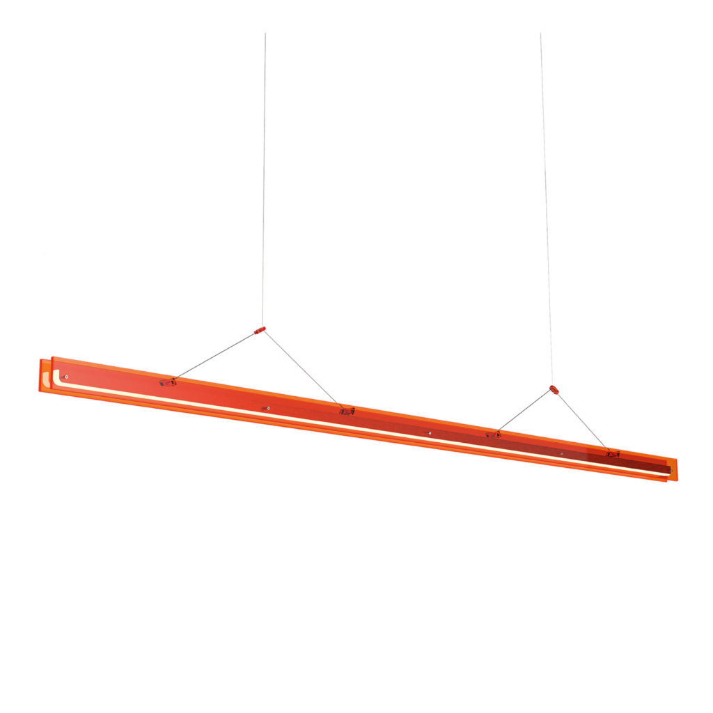 As atmospheric as you want it to be, because Bridge is dimmable. The lamp is available in different lengths. The available lengths are 110, 150, 180 and 220 cm. Bridge is made from recycled plexiglass and is available in the color Fog White and in two striking neon color variations: Lava Orange (fluorescent orange) and Toxic Green (fluorescent green). The transparency of the material creates an interesting layering and impressive light output.