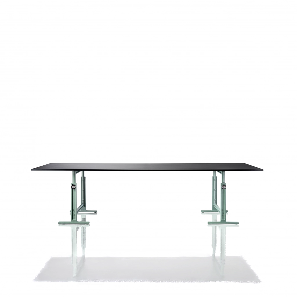 Table. Material: Pair of trestles in cast-iron, painted in polyester powder, adjustable in height. Tops in veneered oak or in steel plate, electro-galvanized and painted in polyester powder.