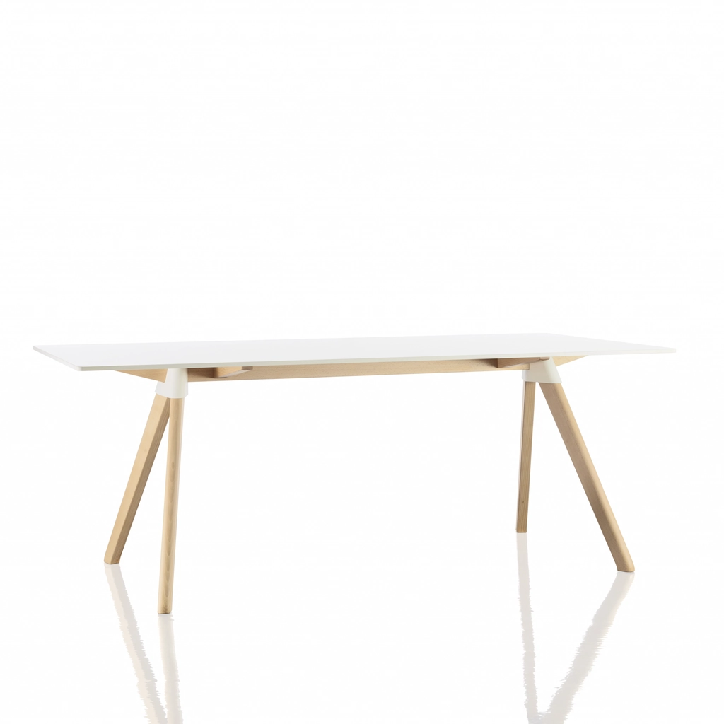 Table. Materials: frame (legs and crosspiece) in natural solid beech; joints in polypropylene with glass fibre added; top in HPL.