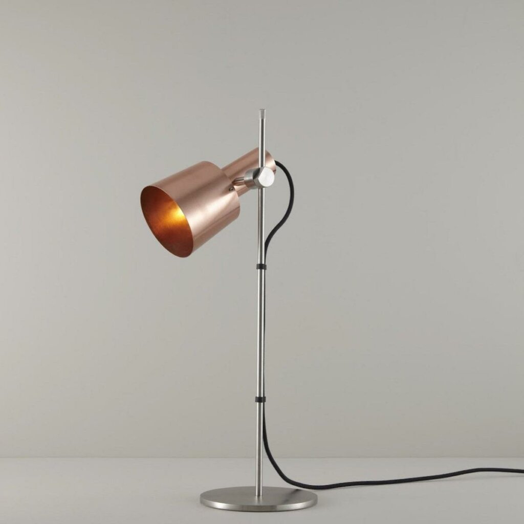 A contemporary and clean lined table light, drawing inspiration from 1960s design the Chester is perfectly suited to illuminating desks and table tops. It features a striking satin brass shade with precision stainless steel metal work. A black cotton braided cable with an inline switch provides a contemporary and practical detail. Also available in satin copper. Read More