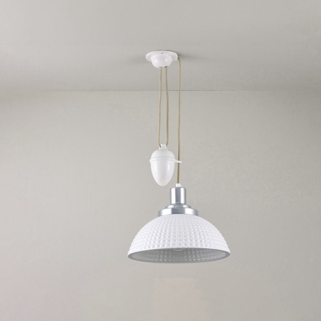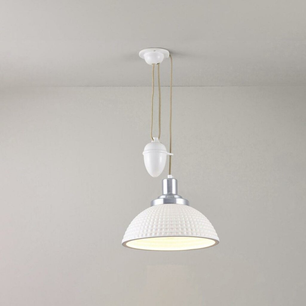 The Cosmo collection includes pendant, rise & fall and table lights with a shortened semi sphere shade. Available in bone china with either a plain, dimpled or stepped finish, the textural shades take on a new dimension when lit. Also available in ribbed prismatic glass.