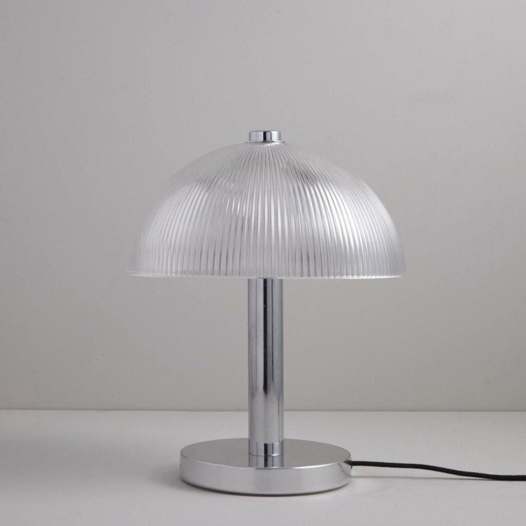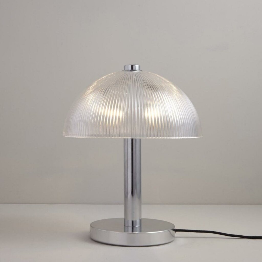The Cosmo Prismatic Table Light has a shortened semi sphere glass shade that gently diffuses a soft ambient glow. Also available as a pendant.