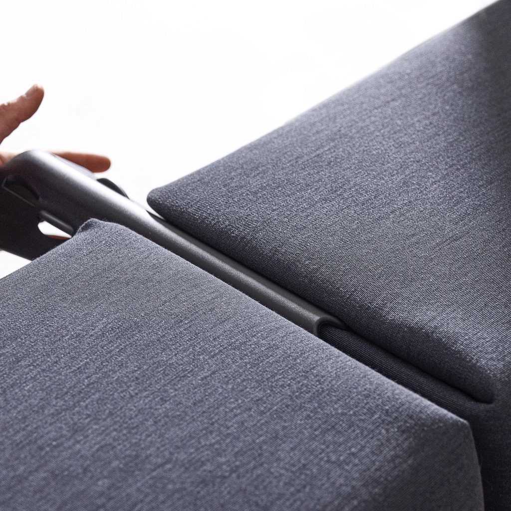 Modular ottoman/sofa with a 4 mm thin structure made from recycled and recyclable polyethylene. Cover in fabric available in 3 categories. The cover is fully removable thanks to the elastic loops hooked into the bottom. The ottoman/sofa can be easily dressed and undressed for cleaning and replacement. The modular system consists of on single unit, which can be interlocked in various constellations or extended with armrests.