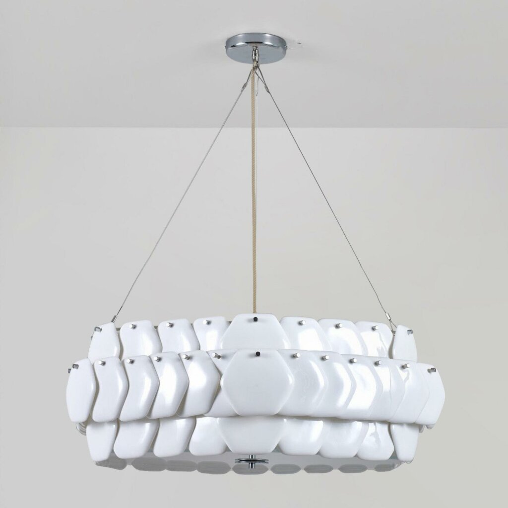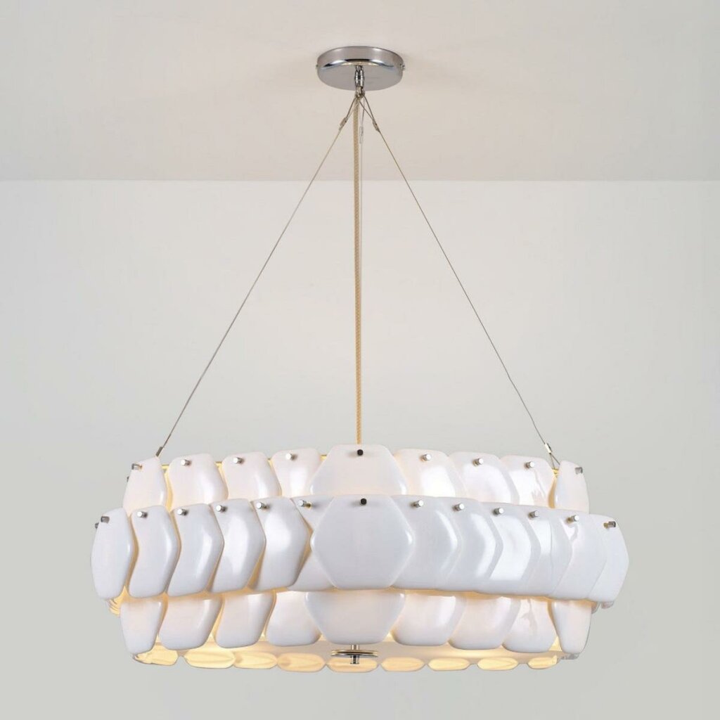 The Cranton 25 Pendant is the latest addition to the glamorous Cranton collection. More compact than the existing Cranton pendants, this hexagonal design features three tiers with overlaying bone china disks. These are poured, fired and polished in our factory in Stoke-on-Trent. With their subtly curved six corners, the disks mirror the outline of the metal frame, underlining the design’s harmony. Some light escapes the gaps between the disk, while most of it is downcast through a glass visor, creating a warm, ambient light. Thanks to its size, the Cranton Three-Tier Hexagonal chandelier is a fantastic option to bring a touch of glamour to a bedroom, hallway or dining room with smaller dimensions. Read More