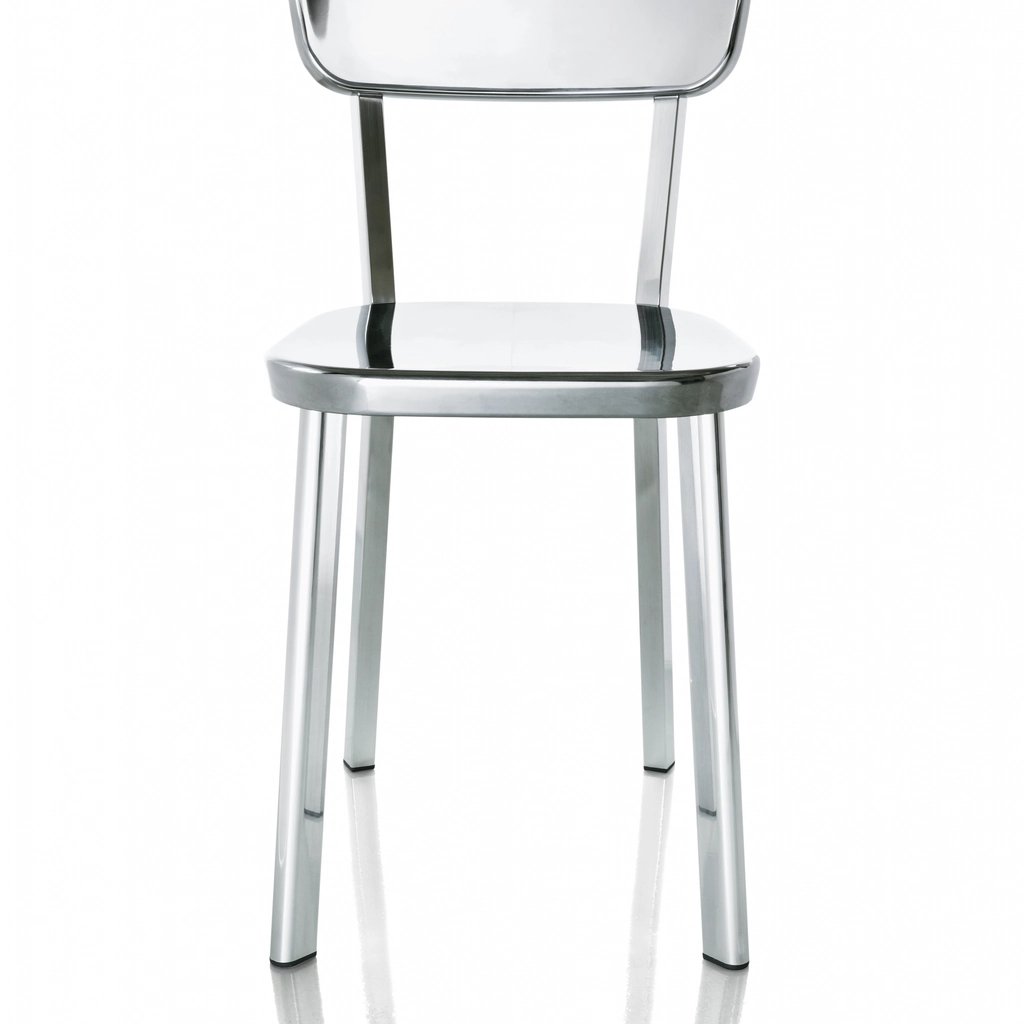 Chair. Material: legs in extruded aluminium polished. Seat and back in die-cast aluminium polished. Flame-retardant.