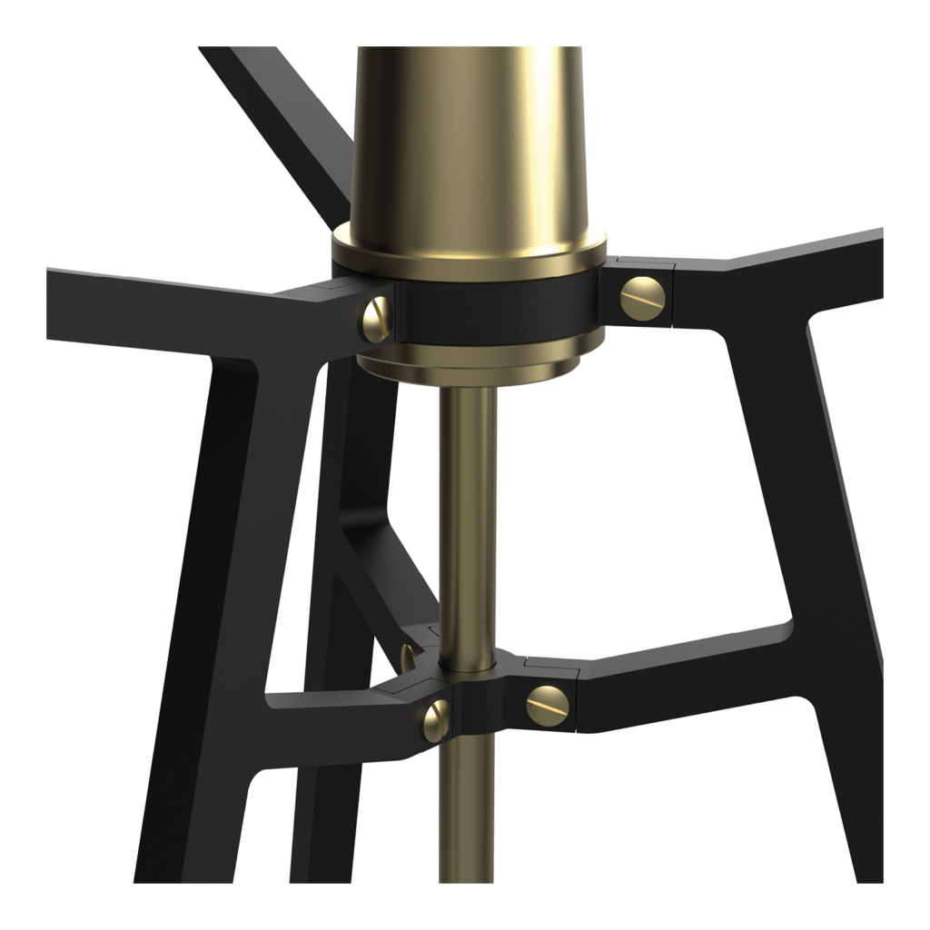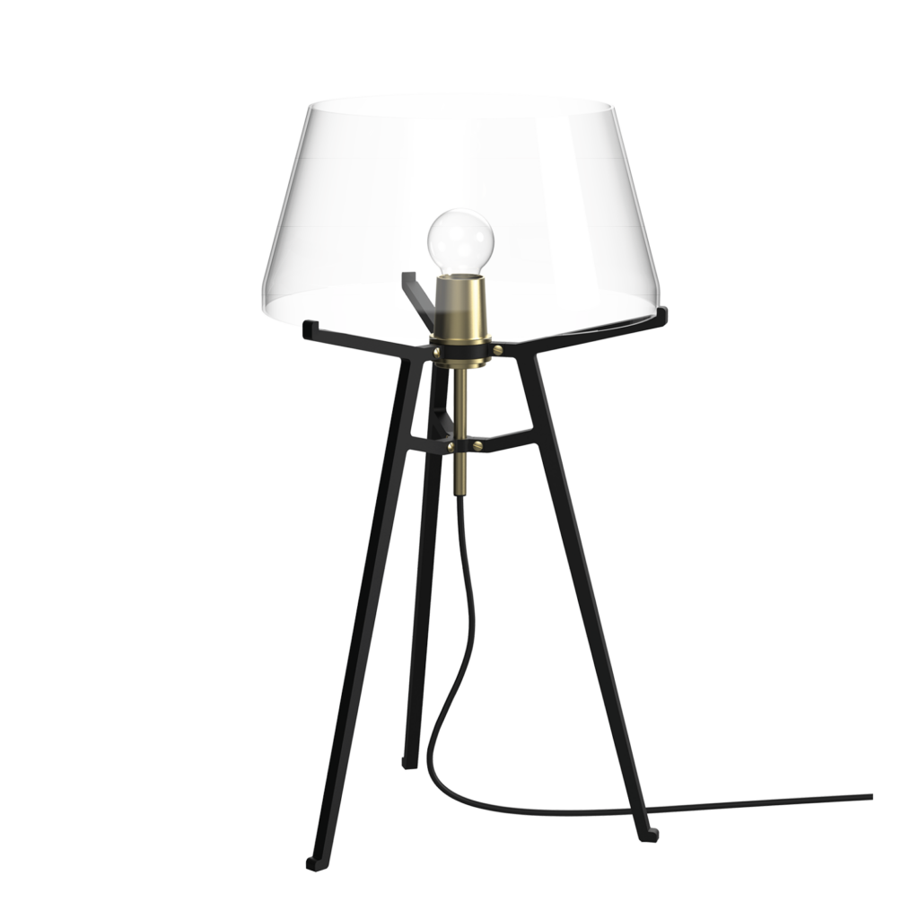 The hand-blown glass shade by Ella sits on a robust steel base, which emphasises the strong, graphic, yet elegant, and light appearance of the lamp. Both the transparent and neutral grey tones of the glass provide a soft glow and blend harmoniously with the black or white base and brass details.