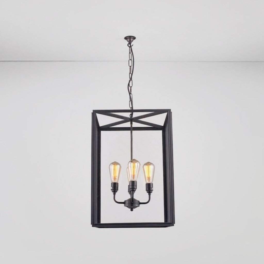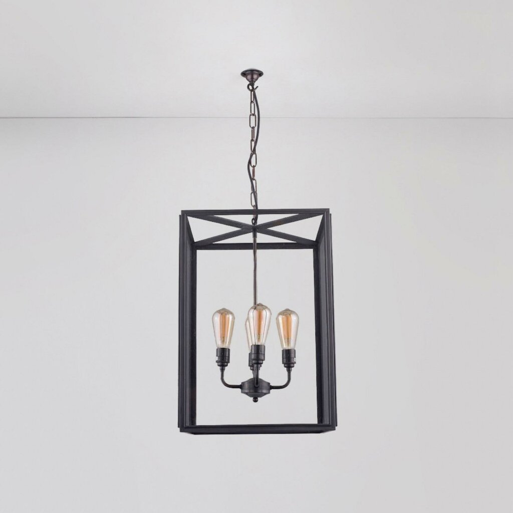 Square Pendant in weathered brass, externally glazed and available in three sizes. Suspended on a weathered brass hook 1.5 meters of chain. Glass on four sides, with open top and base. Suitable for interior use only.
