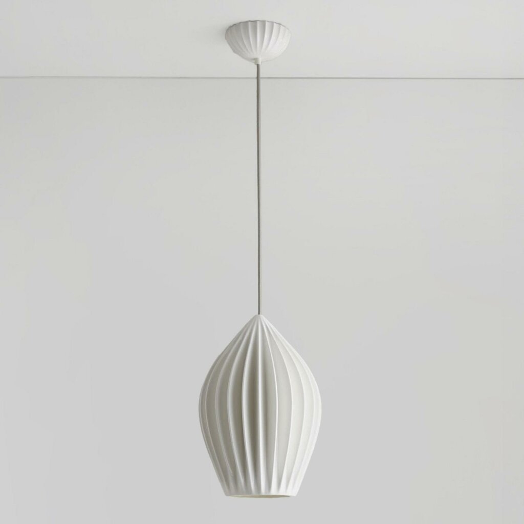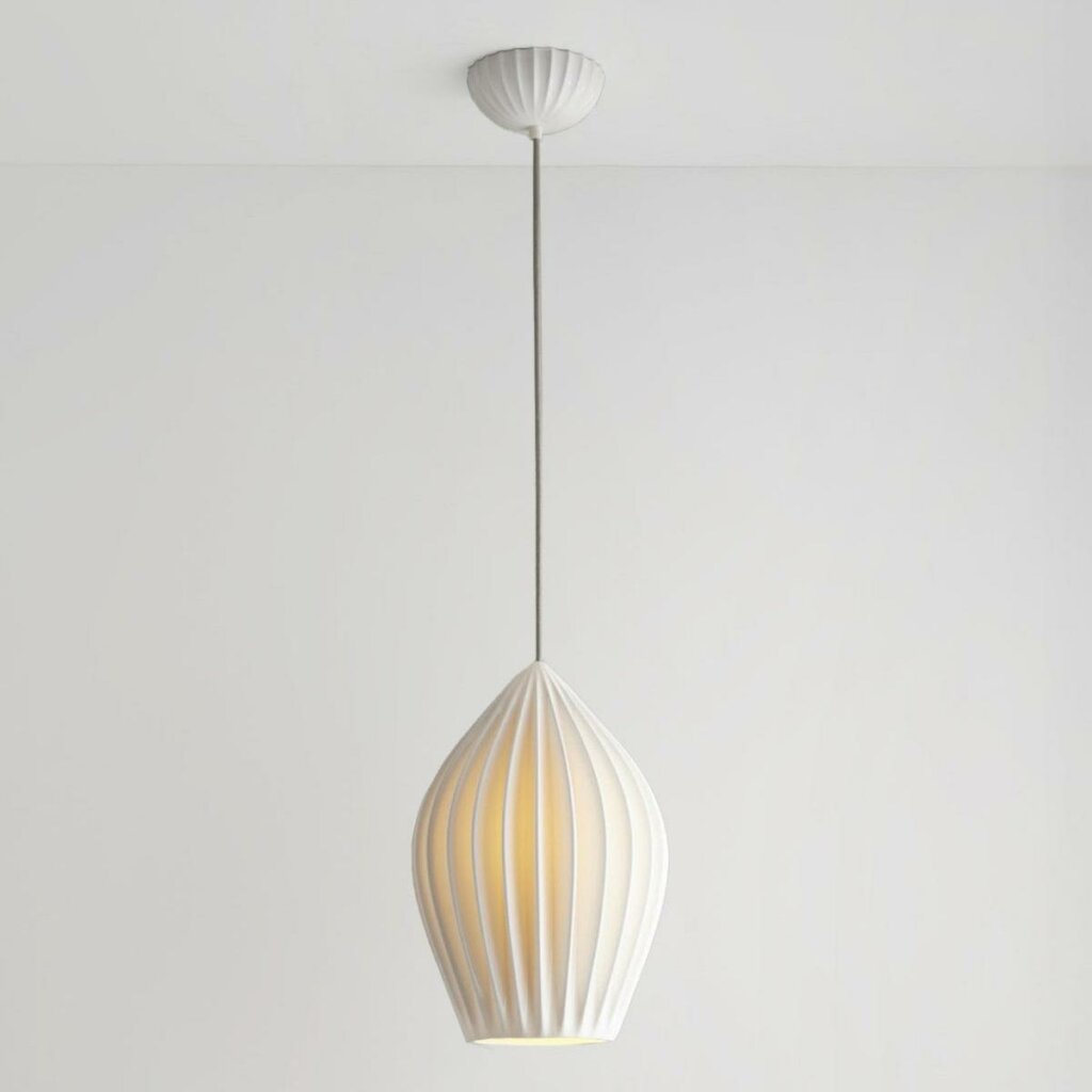 The Fin Pendant is a sophistiacted statement piece. Its bone china shade has been expertly moulded in to beautiful organic shapes, creating dramatic light and shade when lit. Available in three sizes, the lights are complemented by a matching bone china ceiling rose and our trademark cotton braided cable.