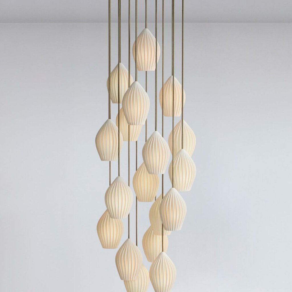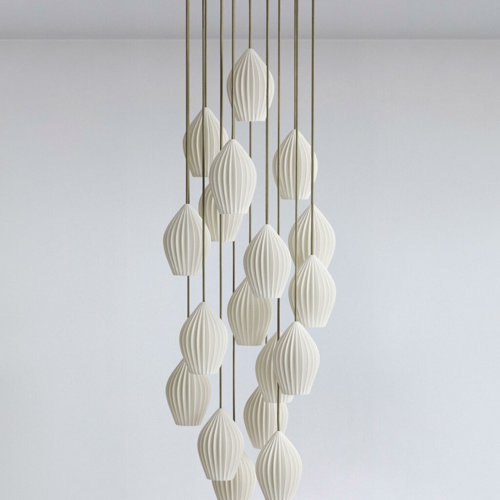 The Fin Grouping brings spectacular impact to one of our most beloved designs. Featuring 12 or 18 individual pendants, this dramatic composition transforms stairways, hallways, receptions and larger living areas. The intricate handmade bone china shades emit a generous downward light while glowing beautifully themselves to enrich the atmosphere of the room. Turned off, the glazed ceramic appears architectural and refined. Perfect for creating a stunning focal point, each grouping is supplied with grey cotton braided cables, and every pendant’s height can be individually adjusted during installation, allowing for a tight cluster or a space-filling cascade of light. Read More
