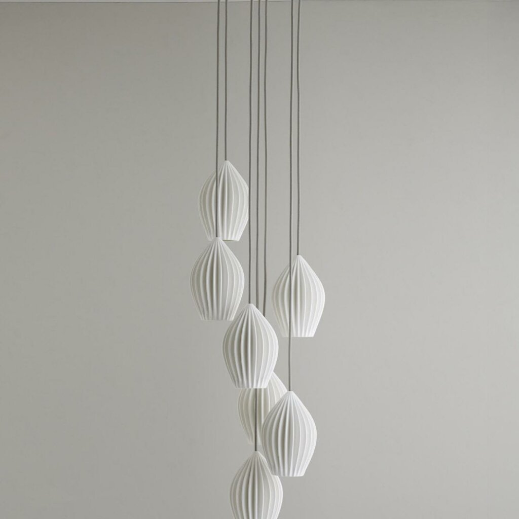 Original BTC's favourite Fin Pendant is also available in a series of eye-catching groupings, perfectly suited for creating a stunning focal point in sitting rooms, hallways, and dining rooms. The intricate and decorative handmade bone china shades will bring an enchanting glow to any setting, and can be hung at different lengths, depending on personal preference. Available in configurations of 7, 12 and 18. Read More