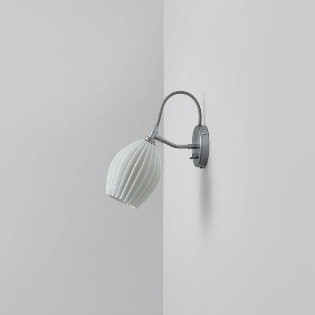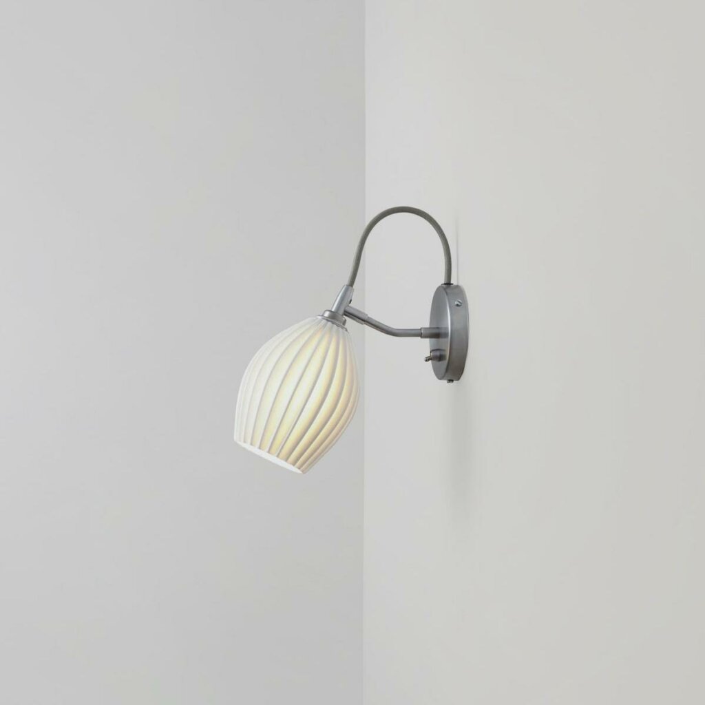 The Fin, with its eye-catching bone china shade, expertly moulded into intricate organic shapes, creates dramatic light when lit and retains a sculptural beauty when off. Handmade in Stoke-on-Trent, its distinctive shade is angled onto a satin chrome back plate. The new grey cotton braided cable complements the style beautifully.