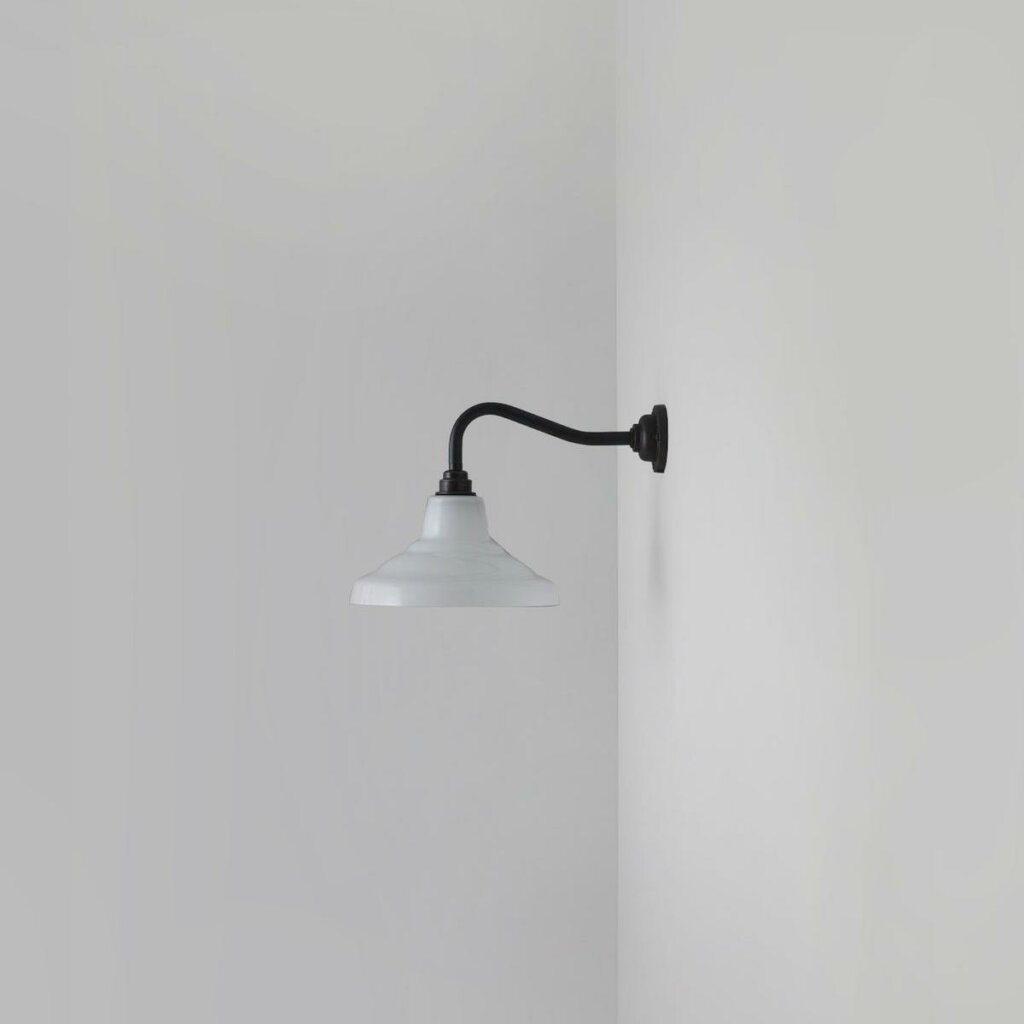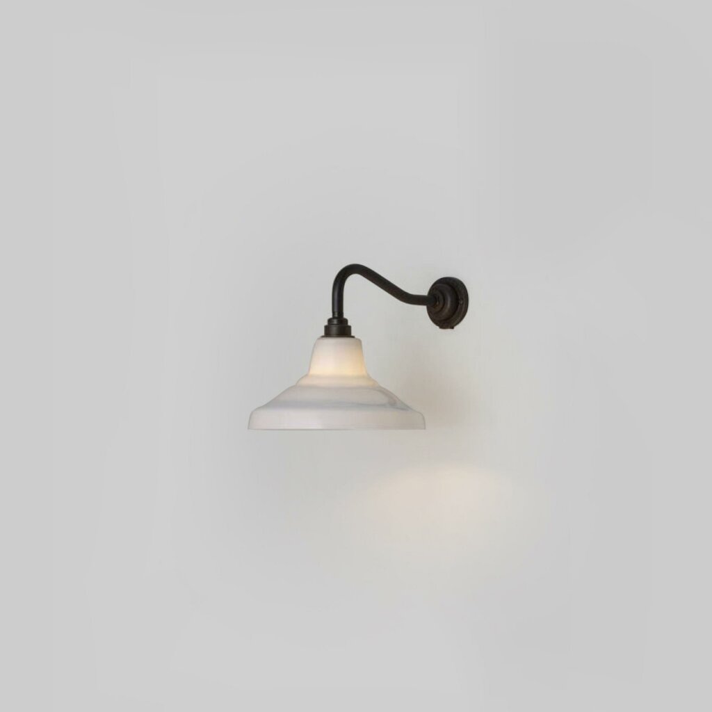 A smaller version of Davey Lighting's classic School Light, produced in hand blown glass, and designed as a compact wall light fitting. The glass shades come in either opal, anthracite and clear glass, with a weathered brass arm and back plate. The anthracite and clear glass shades show off the filament exposed light bulb, a nod to this continuing lighting trend.