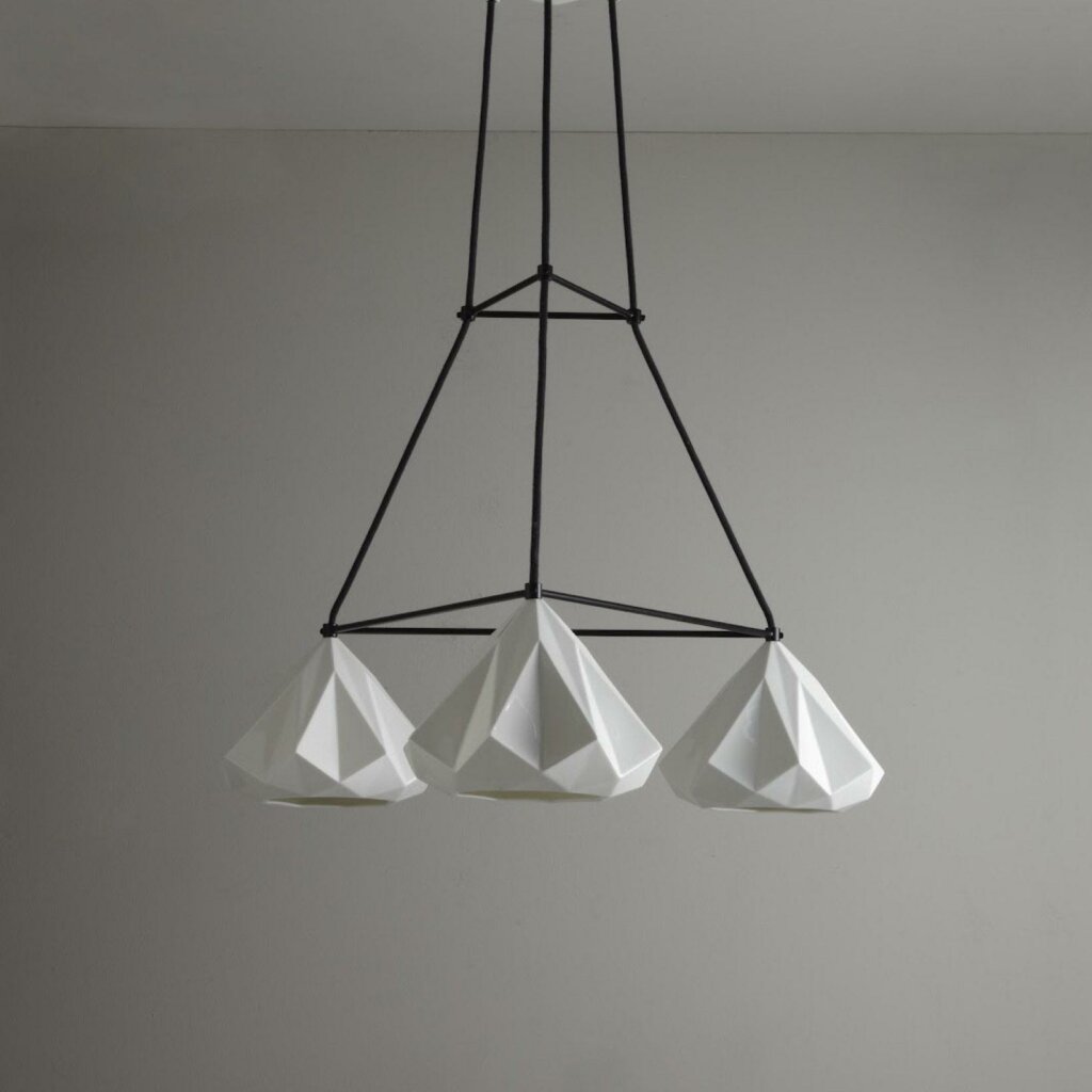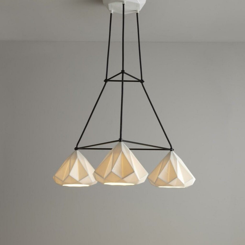 The Hatton 1 Triangular Grouping Pendant is a truly iconic statement piece. Using a highly skilled process, we have been able to transform the bone china shade into an intricate, multi-faceted, gem-like form. When switched 'off' the pendant has an angular sculptural beauty, and when 'on' it provides warm illumination with dramatic lines and shadows. Available in five different designs, each with a matching faceted ceramic ceiling rose, and contrasting black cotton braided cable. Read More