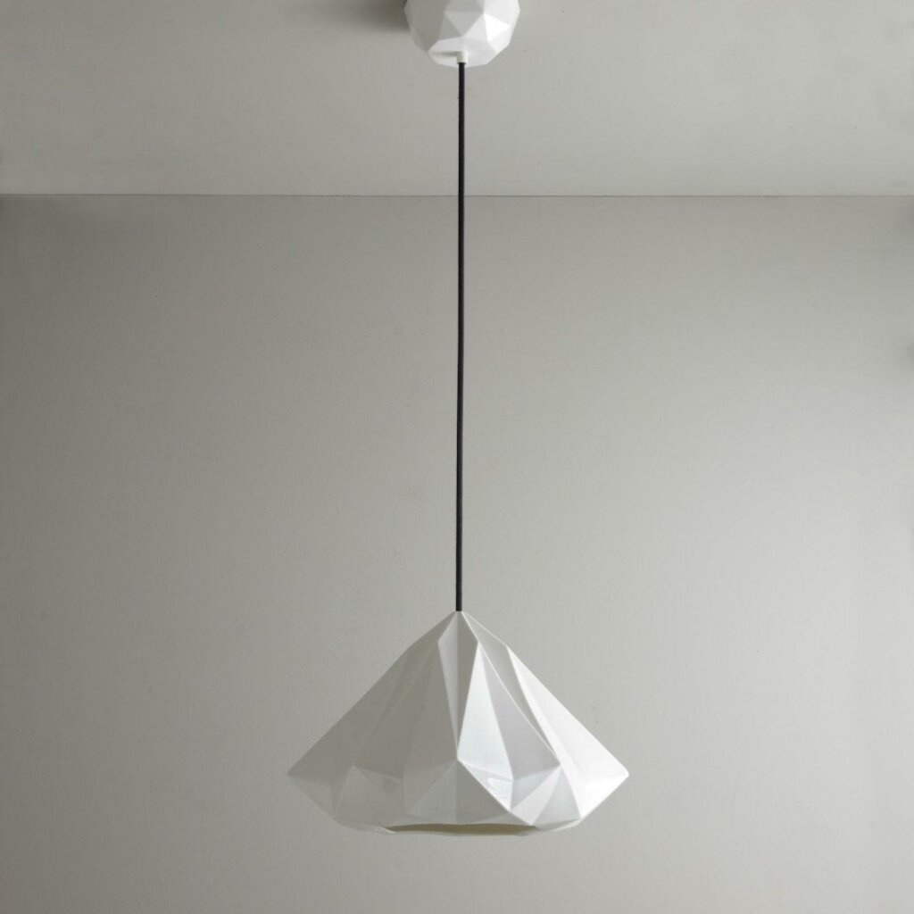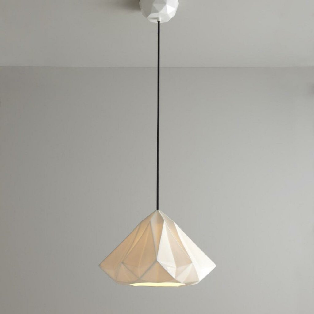 The Hatton 2 Pendant has a beautifully intricate bone china shade. Using a highly skilled process, we have been able to transform bone china into a multi-faceted, symmetrical, gem-like form. When switched 'off' the pendant has an angular sculptural beauty, and when 'on' it provides warm illumination with dramatic lines and shadows. Available in five different designs, each with a matching faceted ceramic ceiling rose, and contrasting black cotton braided cable. For a truly iconic statement piece, choose one of the Grouping of Three or Triangular Grouping styles. Read More