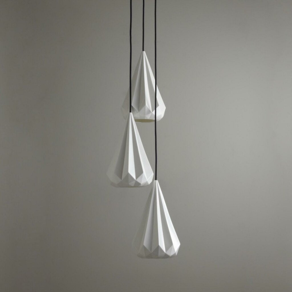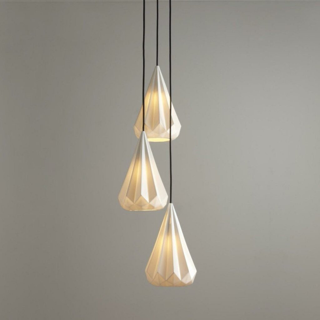 The Hatton 3 Grouping of Three Pendant is a truly iconic statement piece. Using a highly skilled process, we have been able to transform the bone china shade into an intricate, multi-faceted, gem-like form. When switched 'off' the pendant has an angular sculptural beauty, and when 'on' it provides warm illumination with dramatic lines and shadows. Available in five different designs, each with a matching faceted ceramic ceiling rose, and contrasting black cotton braided cable. Read More