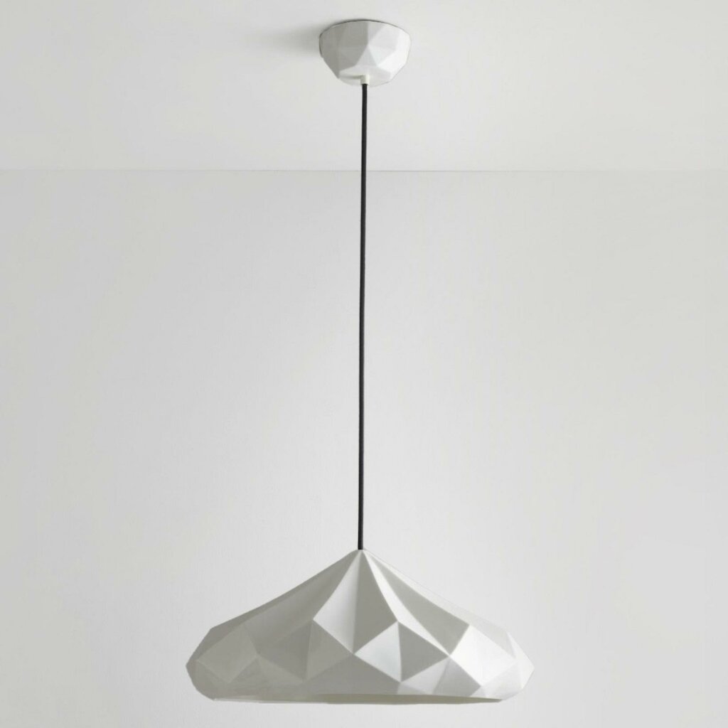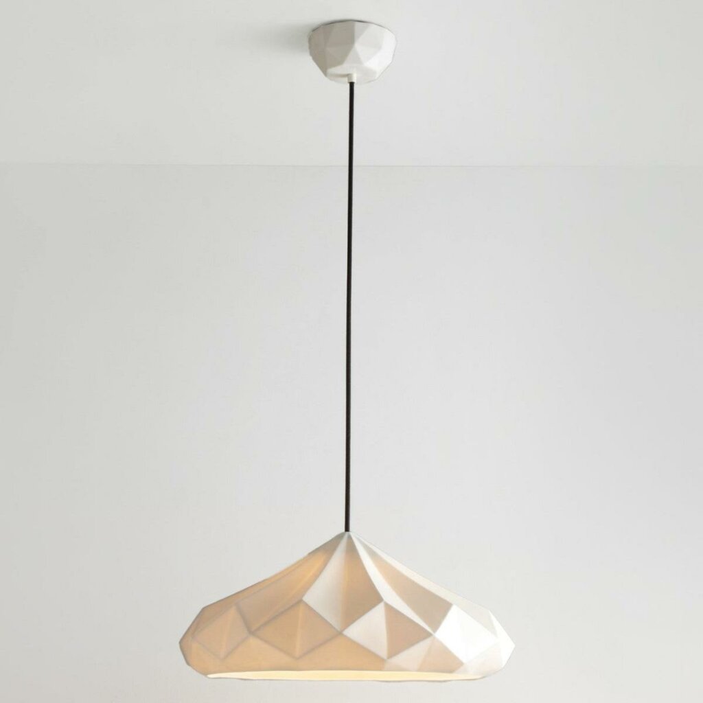 The Hatton 5 Pendant has a beautifully intricate bone china shade. Using a highly skilled process, we have been able to transform bone china into a multi-faceted, symmetrical, gem-like form. When switched 'off' the pendant has an angular sculptural beauty, and when 'on' it provides warm illumination with dramatic lines and shadows. Available in five different designs, each with a matching faceted ceramic ceiling rose, and contrasting black cotton braided cable. For a truly iconic statement piece, choose one of the Grouping of Three or Triangular Grouping styles. Read More
