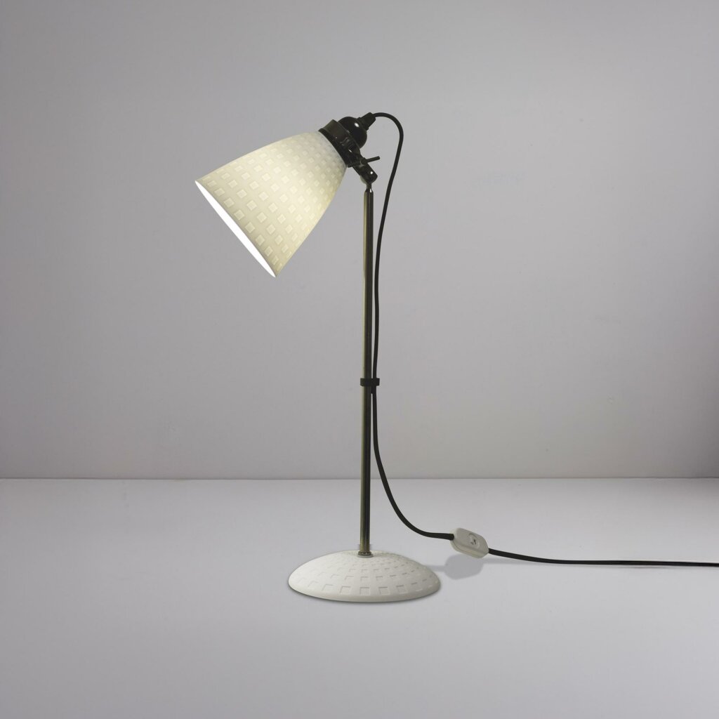 The Hector 21 Table Light is a refined update to our original Hector design, featuring a handcrafted bone china shade with crisp, indented squares. Inspired by the clean lines of the windows of our Stoke-on-Trent pottery, the shade emits a soft, ambient glow when illuminated. A blackened chrome stem and braided black cotton flex complete the sophisticated monochrome look. Made in England with exceptional attention to detail, the Hector 21 adds timeless elegance to any interior. Read More