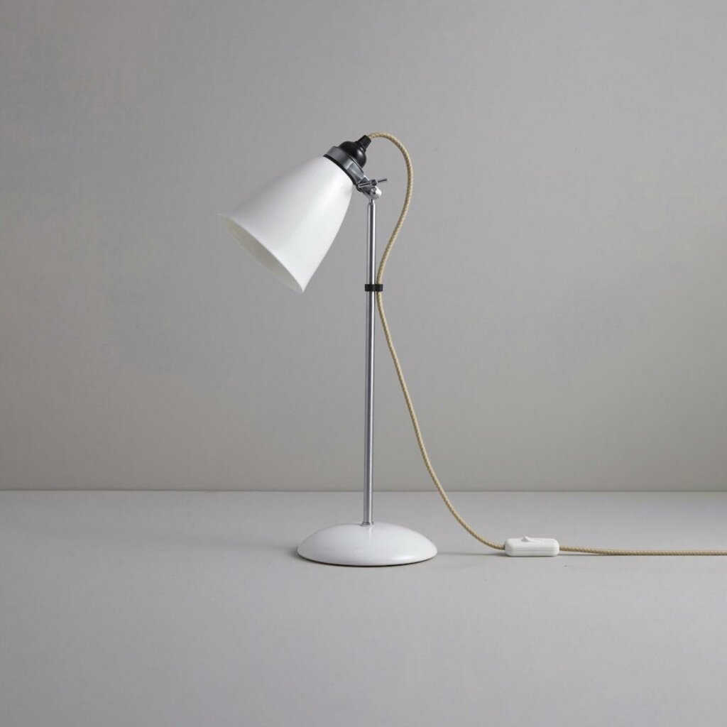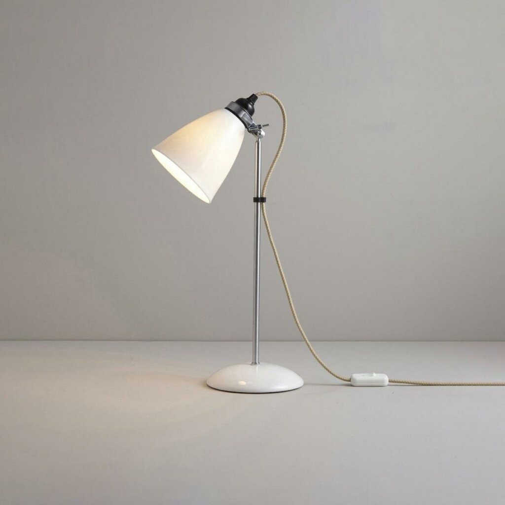 A British design classic in translucent bone china. With its moveable shade and smart cotton braided cable, the Hector Table Light perfectly combines style and function. Available in three colours (natural white, light blue or light green) with varying sized shades.