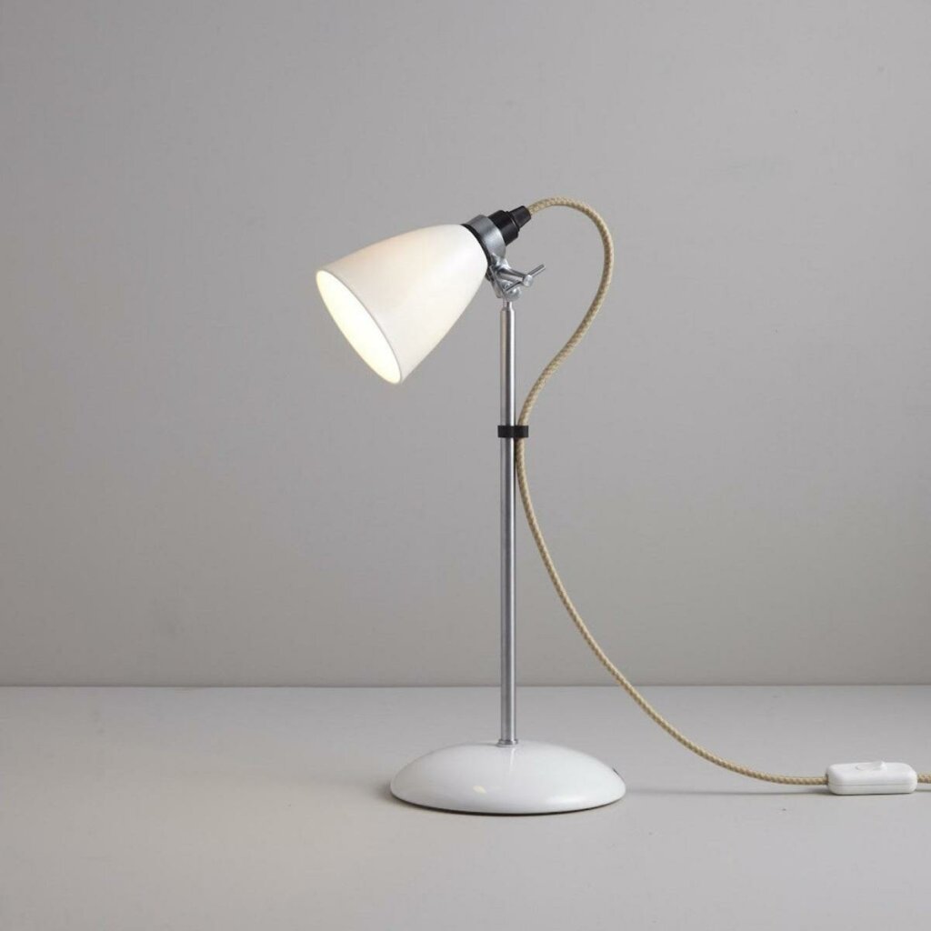 A British design classic in translucent bone china. With its moveable shade and smart cotton braided cable, the Hector Table Light perfectly combines style and function. Available in three colours (natural white, light blue or light green) with varying sized shades.