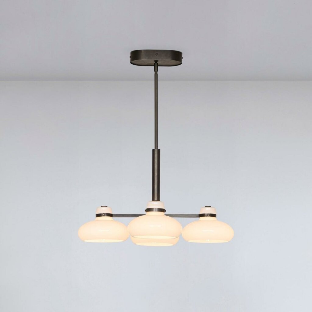 The Magnus pendant captures the fluidity and natural movement of molten glass. Sculptural shades in soft opal white are held in a sleek metal frame in rich blackened bronze. The fixture provides plenty of direct lighting to surfaces below, while the shades emit a warm glow, enriching the atmosphere of any room. Every angle has been considered, ensuring the pendant appears clean and refined even when viewed from above, and maintains its integrity across a wide range of interiors. The Magnus pendant with four shades brings sculptural elegance to living rooms or cosy dining areas. The Magnus series also includes a version with six shades and three models with shades arranged in a linear formation. Read More