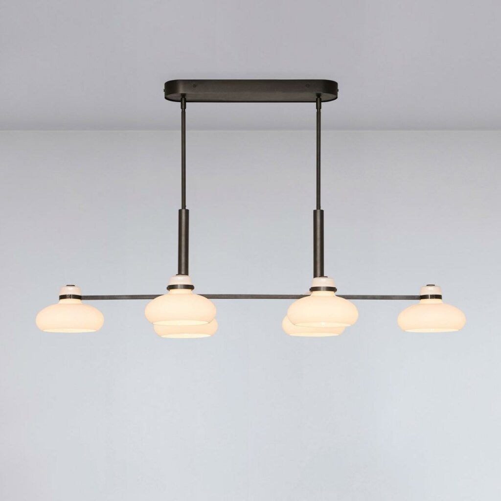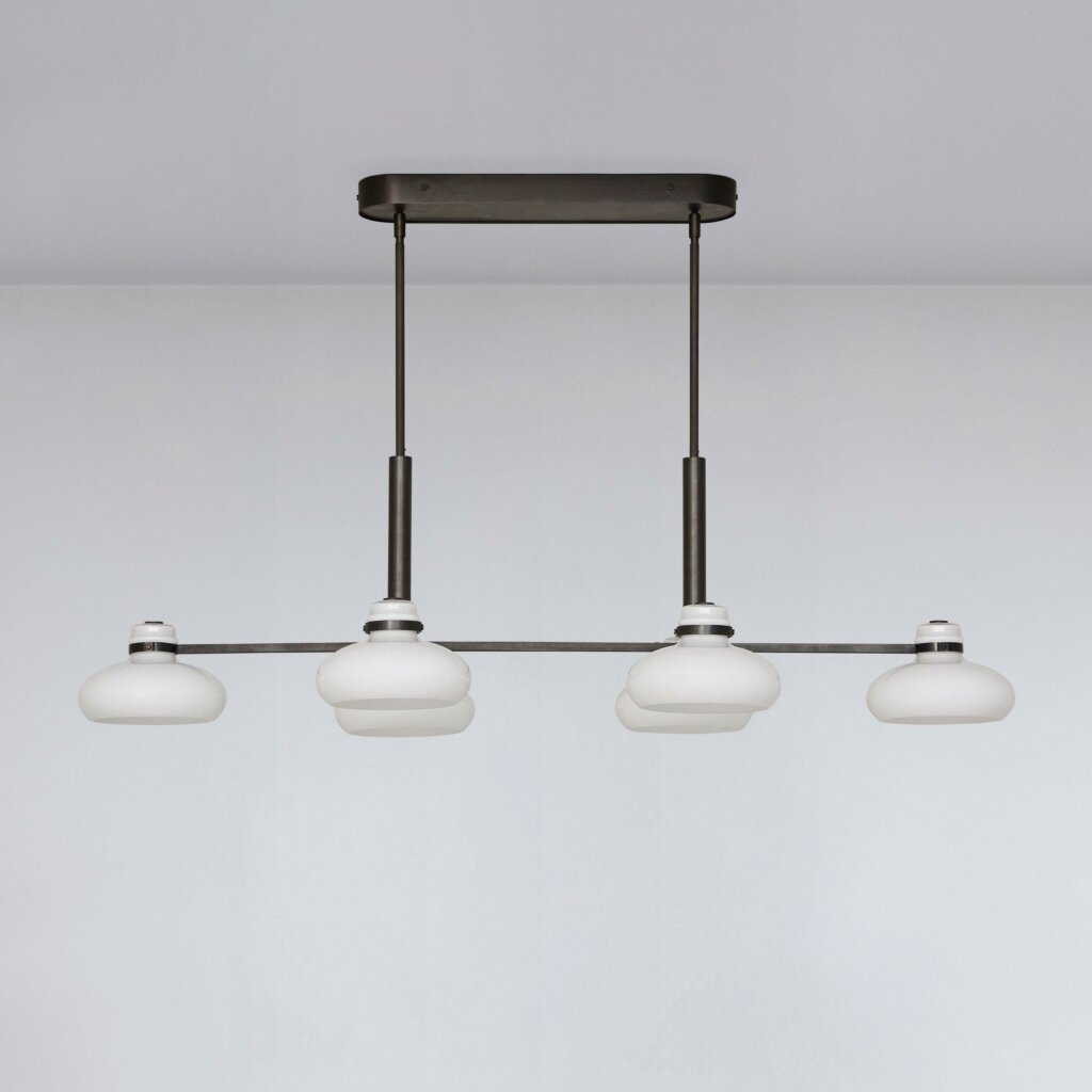 The Magnus pendant captures the fluidity and natural movement of molten glass. Sculptural shades in soft opal white are held in a sleek metal frame in rich blackened bronze. The fixture provides plenty of direct lighting to surfaces below, while the shades emit a warm glow, enriching the atmosphere of any room. Every angle has been considered, ensuring the pendant appears clean and refined even when viewed from above, and maintains its integrity across a wide range of interiors. The Magnus pendant with six shades makes a bold statement in larger living rooms, dining rooms, or entryways. For more compact spaces, the series also include a version with four shades and three models with shades arranged in a linear formation. Read More