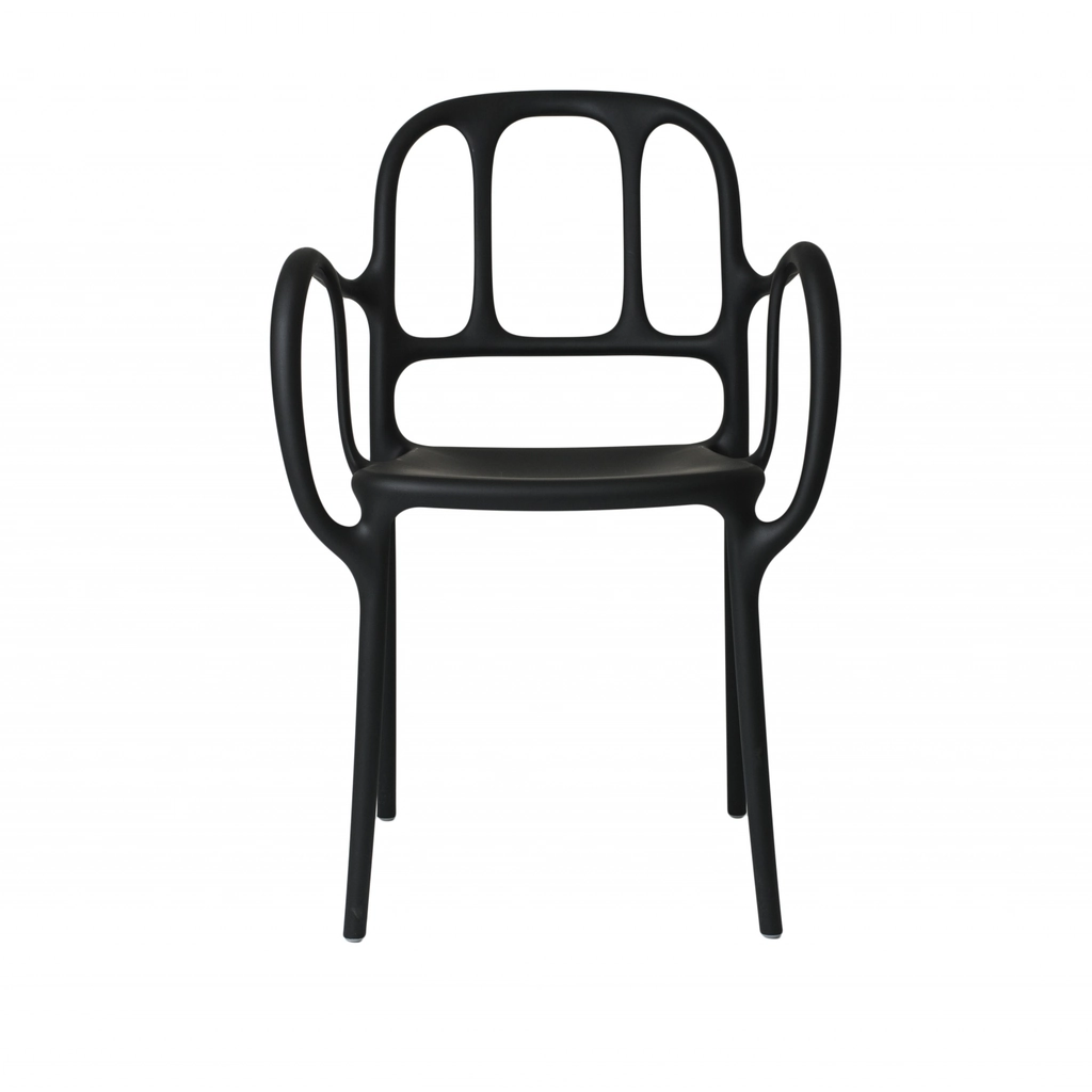 Stacking chair with arms. Material: Polypropylene with glass fiber added. Air-moulded. Silky touch finish. Suitable for outdoor use.
