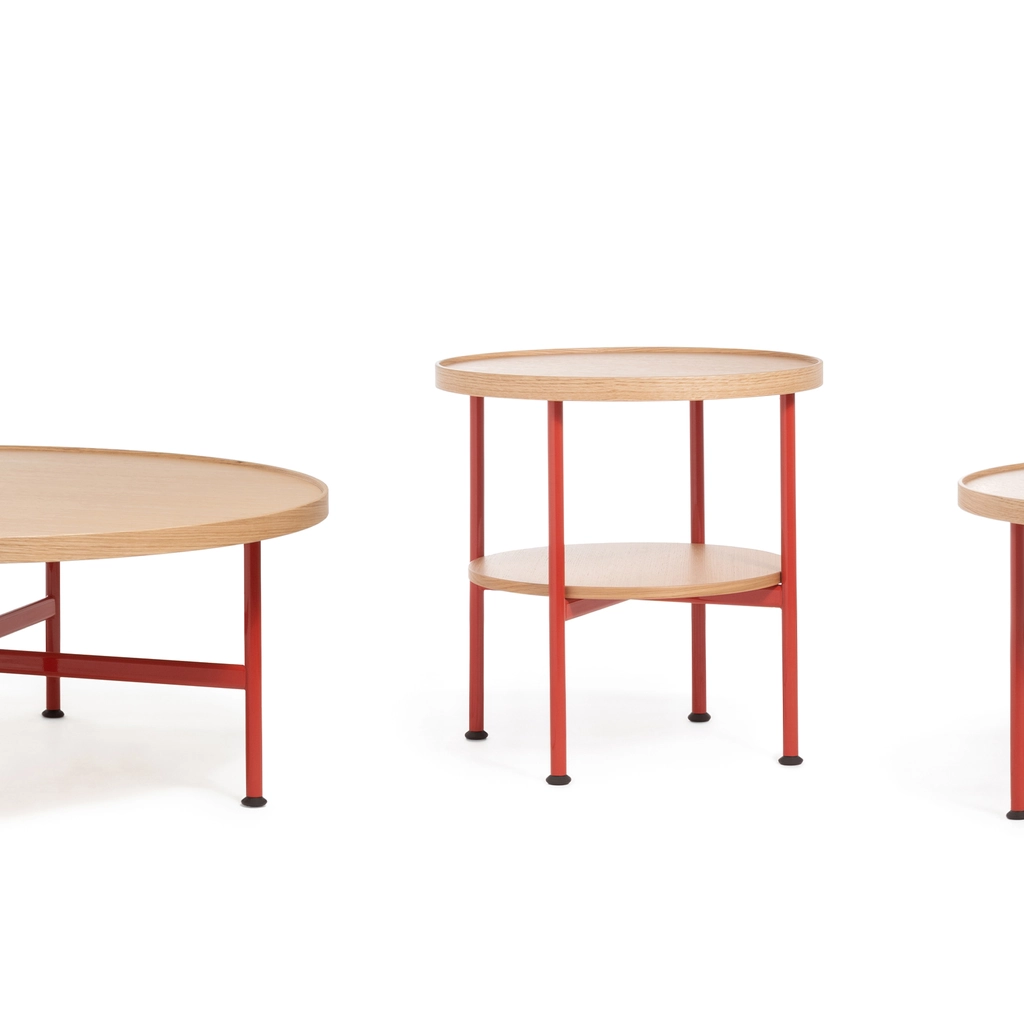 Low tables. Materials: frame in steel tube, glossy painted. Top in veneered oak, natural. Available extra top (ø41,5) for ø50 cm low table.