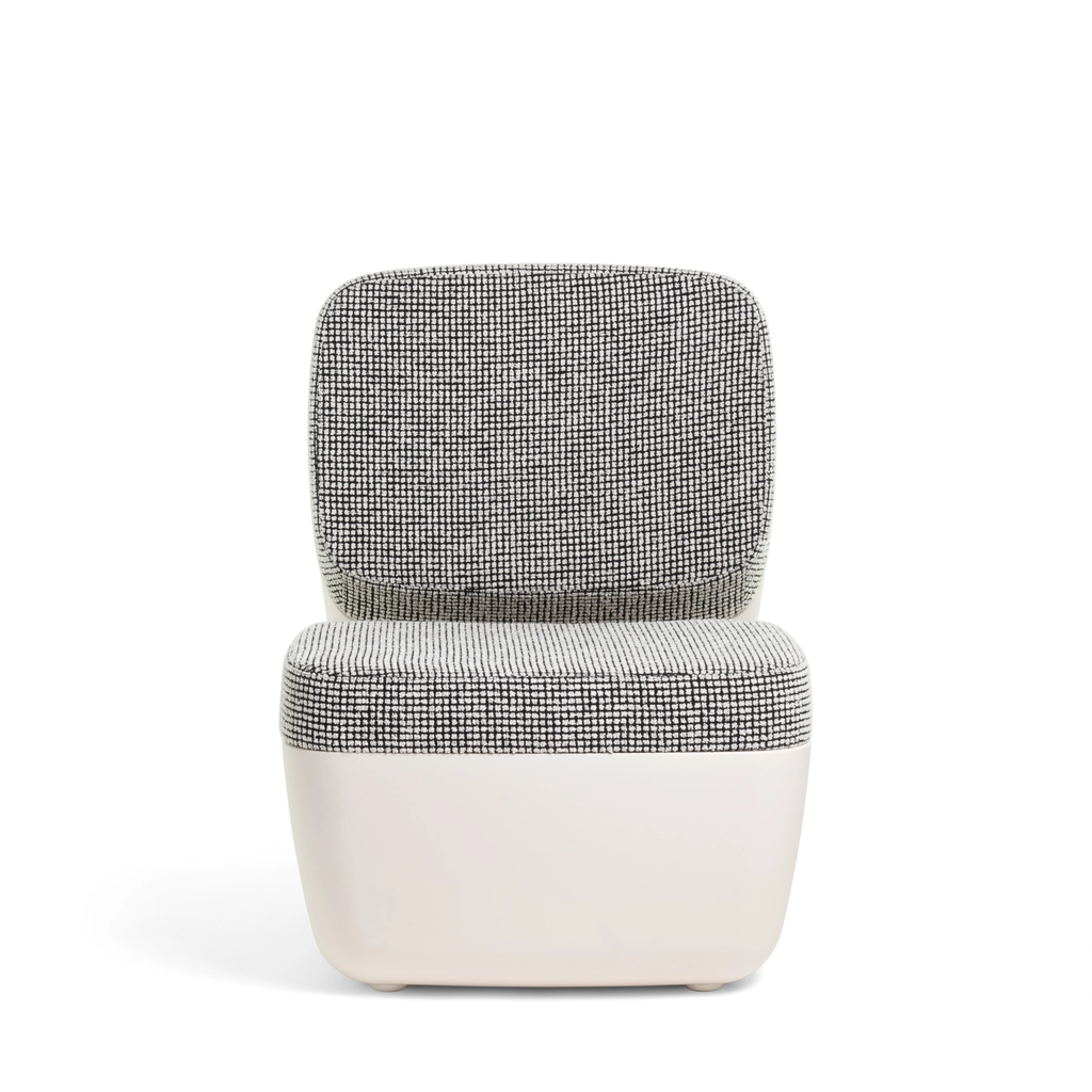 Lounge chair. Material: shell in rotational-moulded polyethylene. Seat and back cushions covered in fabric (Kvadrat “Divina 3”, “Steelcut 3” and Torri Lana “Brionne”).