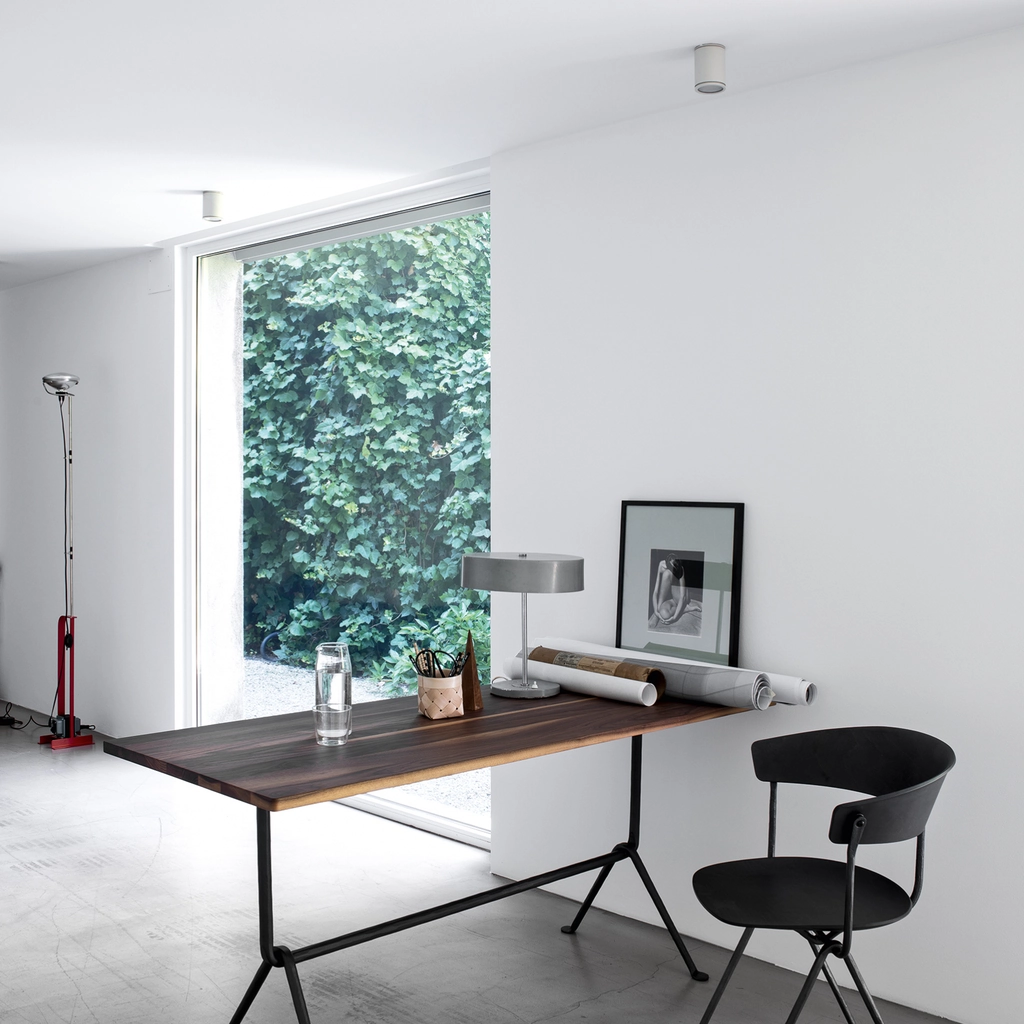 Table. Materials: frame in wrought iron, galvanized or cataphoretically-treated and painted in polyester powder. Top in Carrara marble.