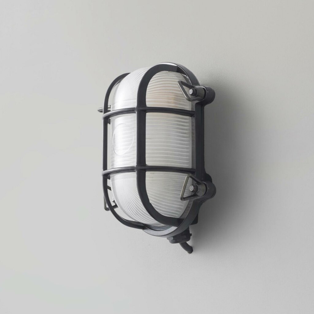 A traditional die-cast brass bulkhead light with frosted, prismatic glass diffusers from Davey's original catalogue. Available in three different finishes - natural brass (unlacquered), weathered brass and chrome plated - and three sizes. Front guards secured by four wing nuts. Glanded surface cable entry.