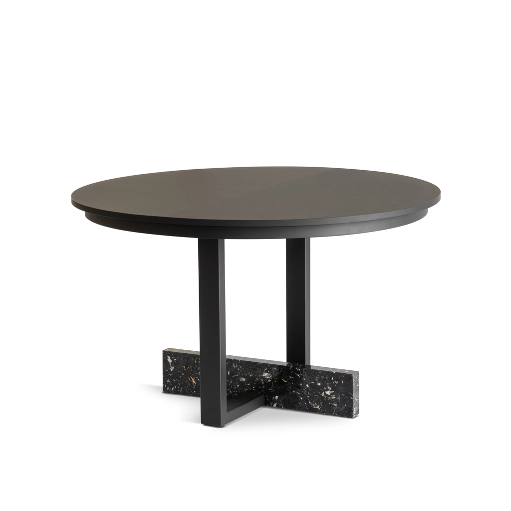 Extending table. Materials: frame in painted steel. Base in recycled marble (black Portoro). Top and leaves in Fenix laminate.