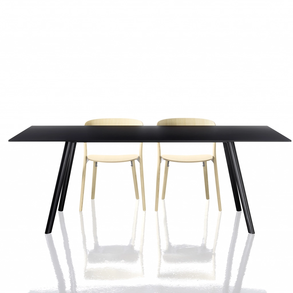 Tables. Materials: legs in solid ash, natural or painted; crosspieces in steel tube painted in epoxy resin; joints in die-cast aluminium sanded or painted in epoxy resin; top in HPL or in veneered oak MDF.