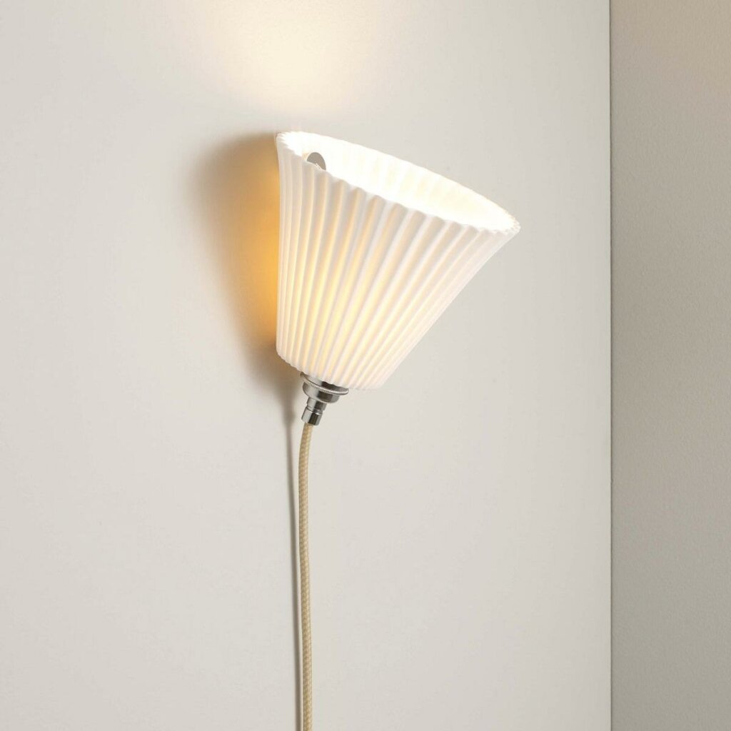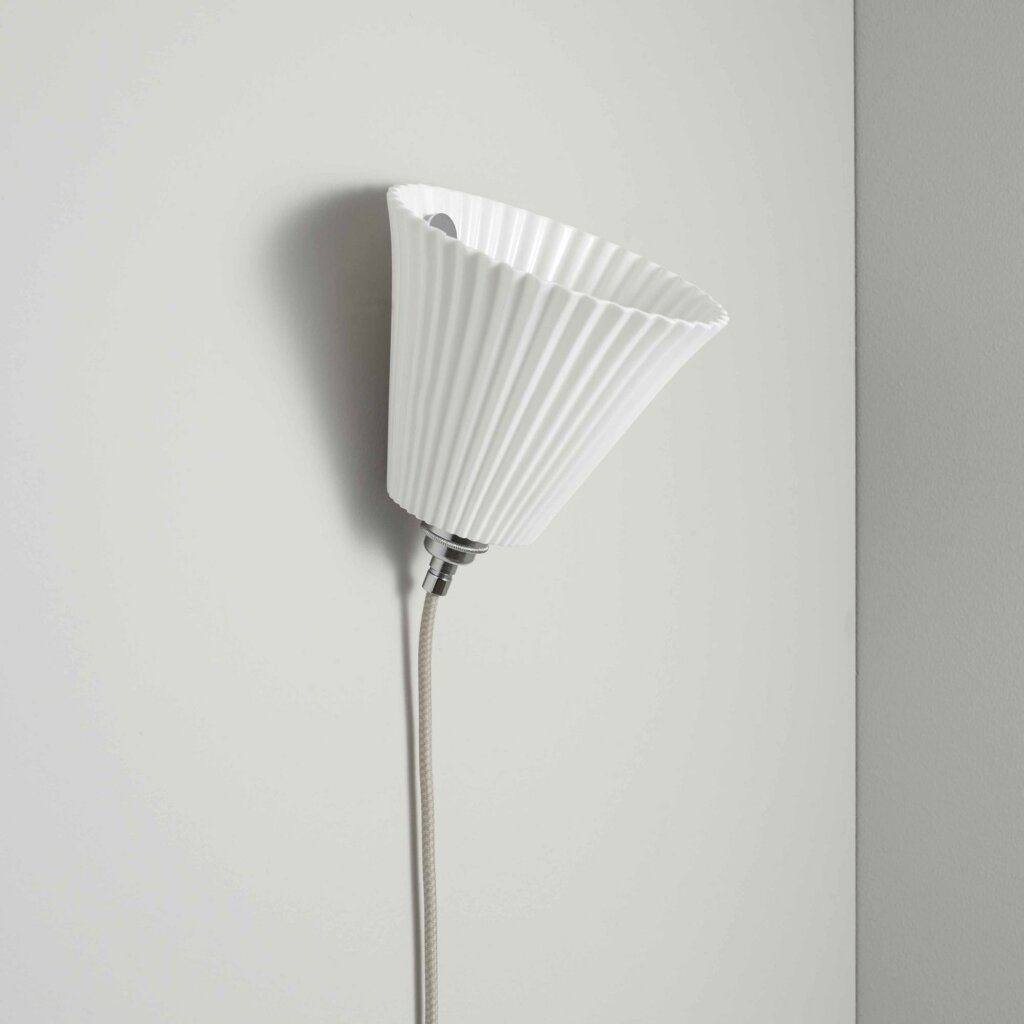 The Portable Pleat is our most flexible wall light. A pleated bone china shade is held to the wall by a satin chromed round wall fixing. Available in two shade sizes, the light has 2.5 metres of cotton braided cable with an inline switch and plug. This allows for the light to be positioned anywhere, without needing hard wiring.