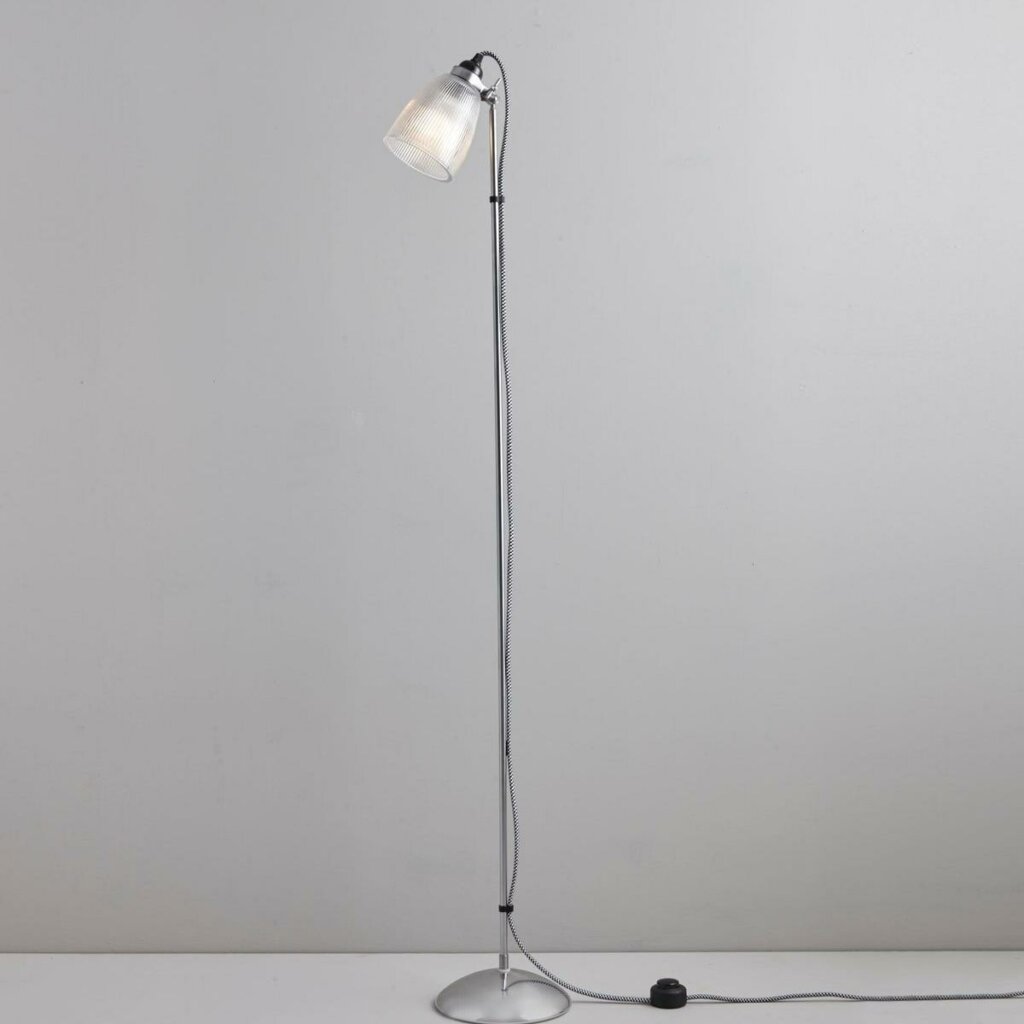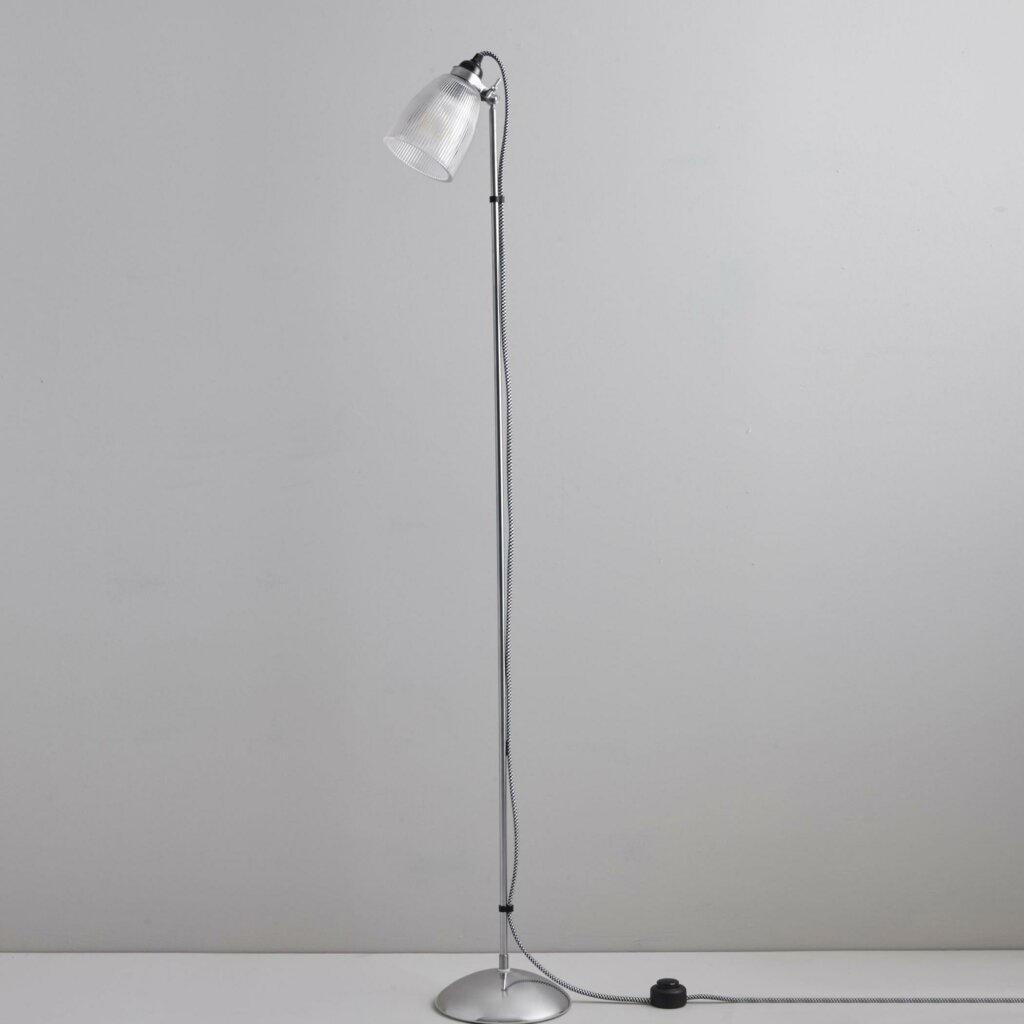 Our Primo Floor Light features a unique black & white cotton braided cable, sleek chrome arm and base, and an intricate glass prismatic shade that gently diffuses light. Also available as a table light.