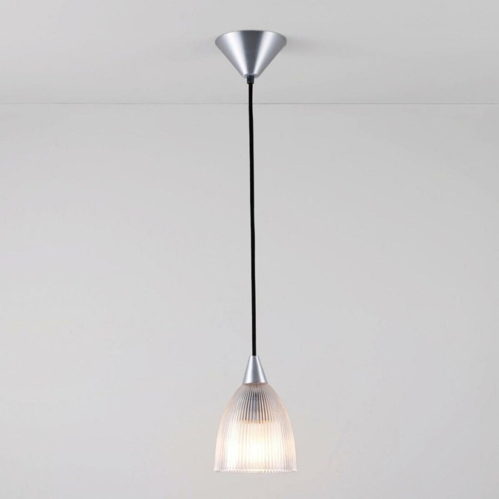 A moulded prismatic glass shade pendant light which sparkles and refracts light, providing an even, glare-free illumination whose tone can be changed dependent on the bulb used.