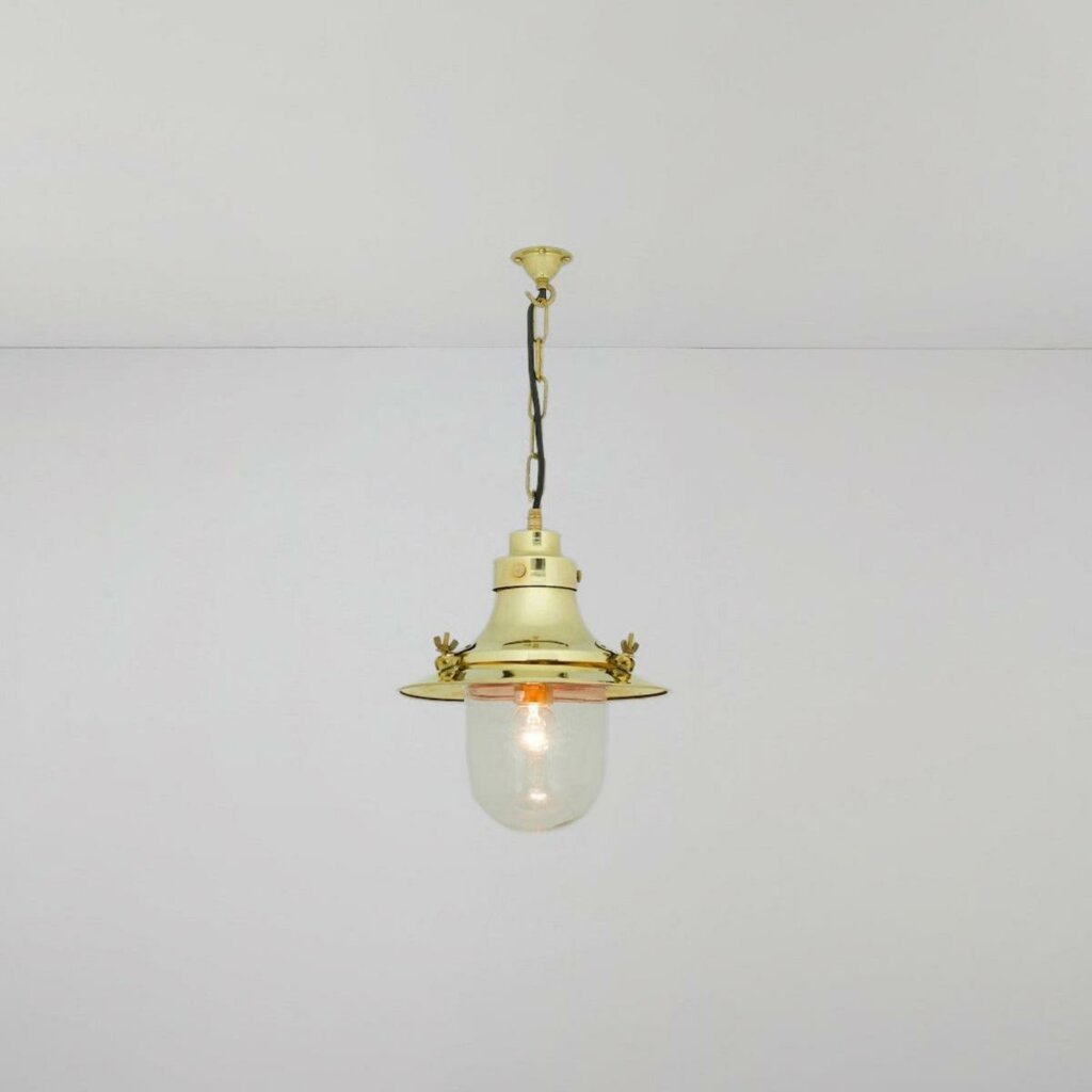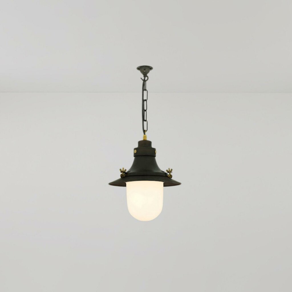 Our Ship's Small Decklight Pendant, spun in brass or copper and fitted with clear or opal glass, is a stunning marine-inspired hanging light. Available in a range of finishes, which include polished lacquered, weathered or matt black with a complementary ceiling hook and chain.