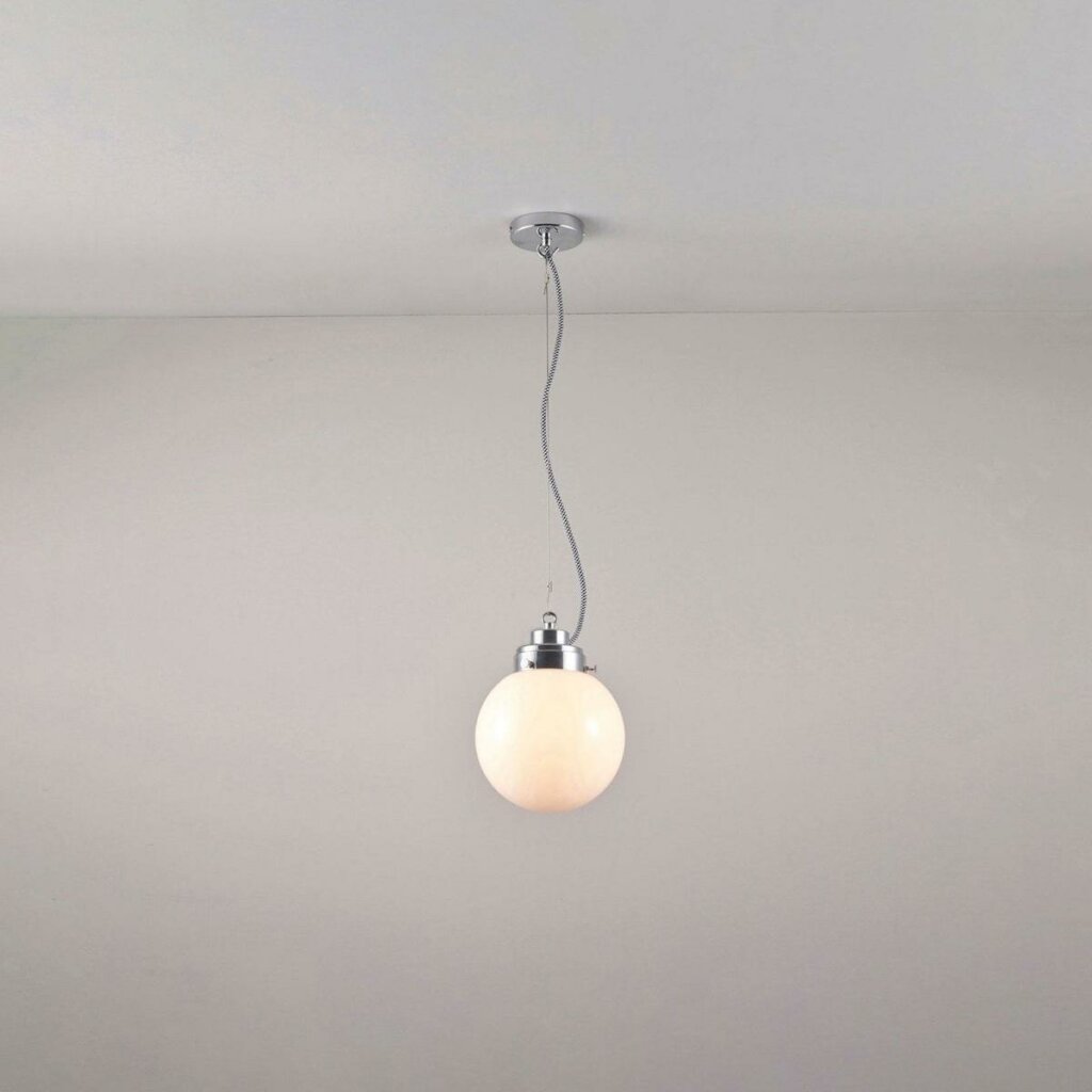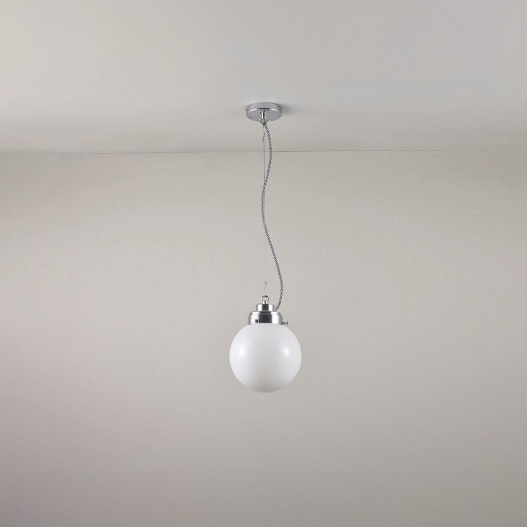 An elegant glass Globe Pendant that really packs a punch. Available in three different sizes and in various glass finishes. Choose between an opal, anthracite, clear seedy or anthracite seedy glass shade, with polished chrome or brass metalwork. The exposed squirrel cage light bulb adds contemporary style and the black & white cotton braided cable complements the design nicely.