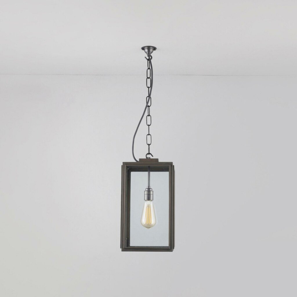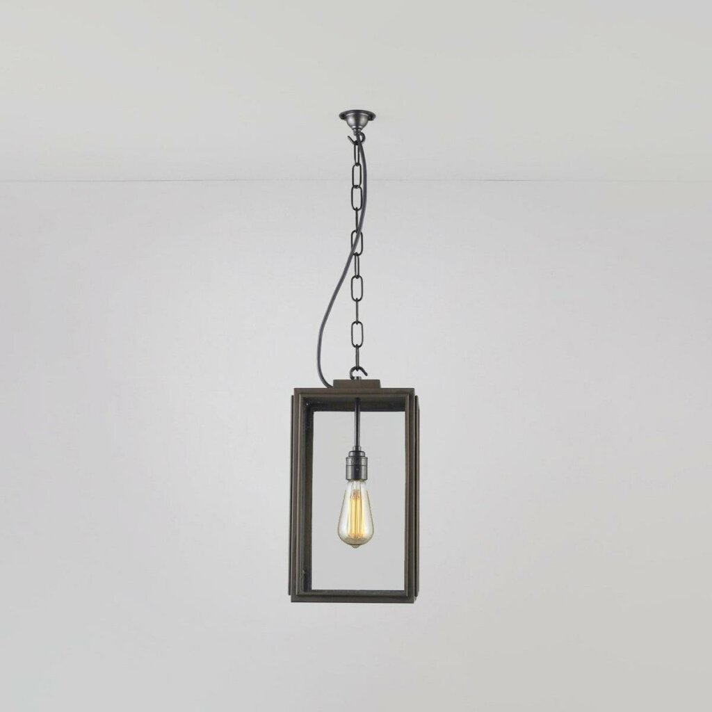 Exterior Square Pendant in weathered brass, externally glazed and available in three sizes. Suspended on a weathered brass hook 1.5 meters of chain. Glass on four sides, with a closed top for exterior use.