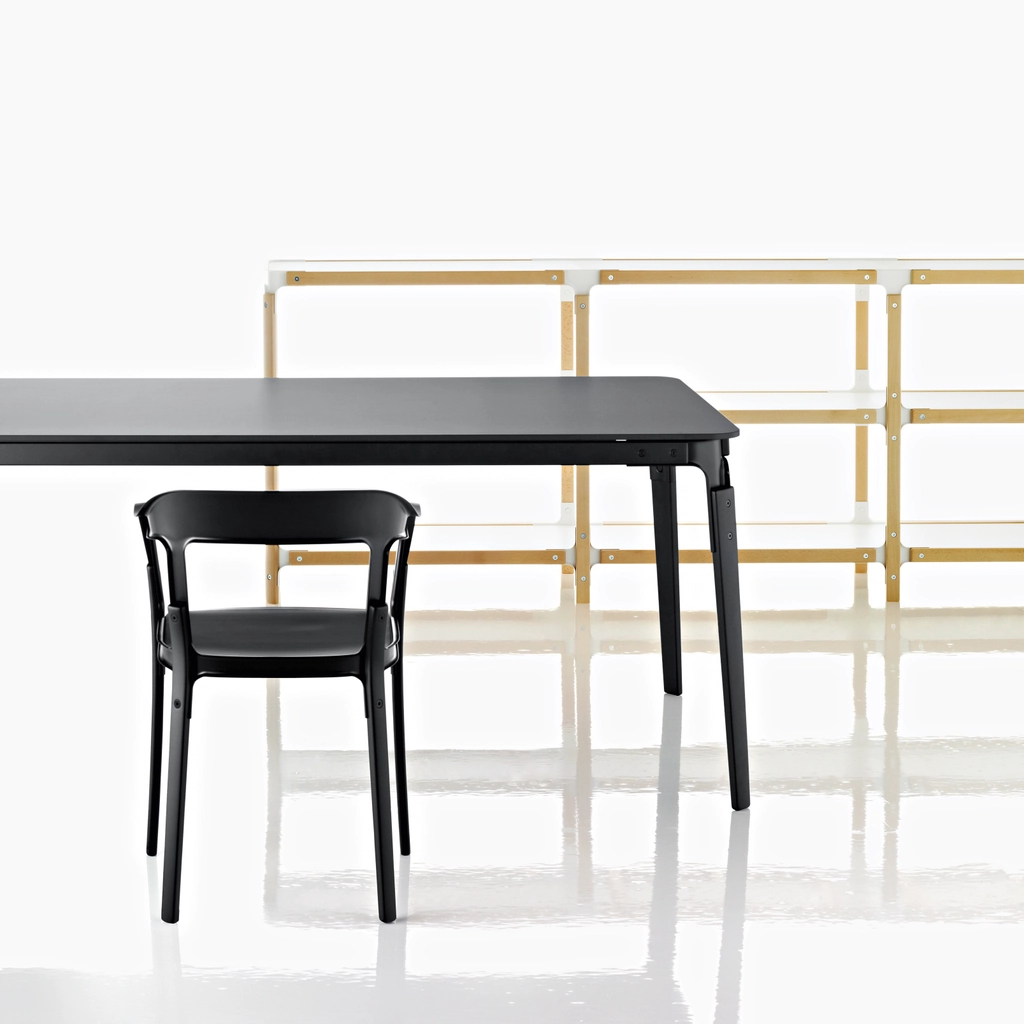 Table. Material: legs and crosspieces are in solid beech (natural or painted). Joints in steel plate painted in polyester powder. Top in HPL.
