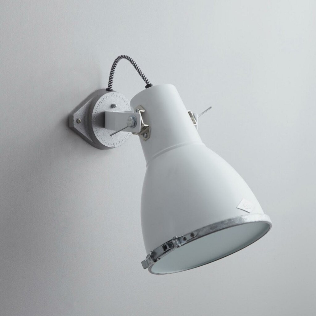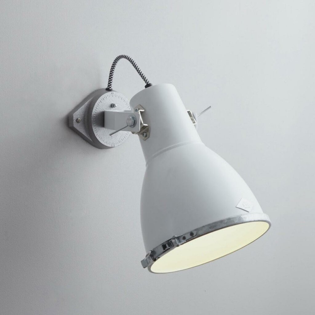 Inspired by the searchlight on the back of a toy lorry, the Stirrup collection is the ultimate in industrial chic. The Stirrup 2 Wall Light features a positionable shade and frosted glass visor to prevent glare and provide a softer, more diffused light. Available in black, white and natural aluminium, and three sizes.