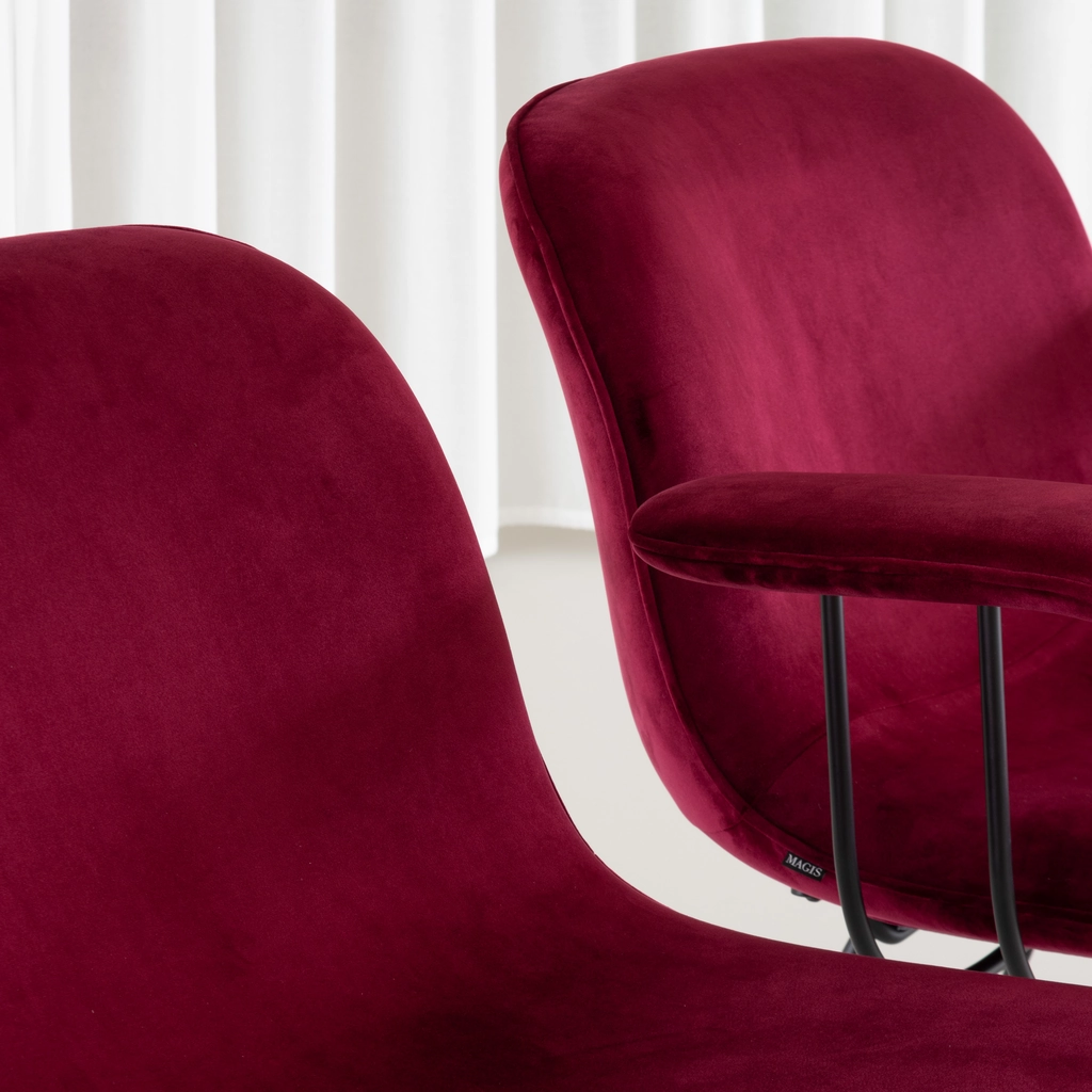 Low chair. Materials: frame in steel rod painted in polyester powder. Cushions in expanded polyurethane with removable cover in fabric (Velvet Dama, Kvadrat Divina MD, Kvadrat Divina Mélange).