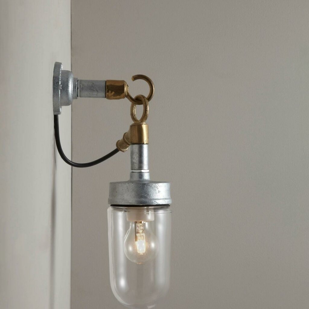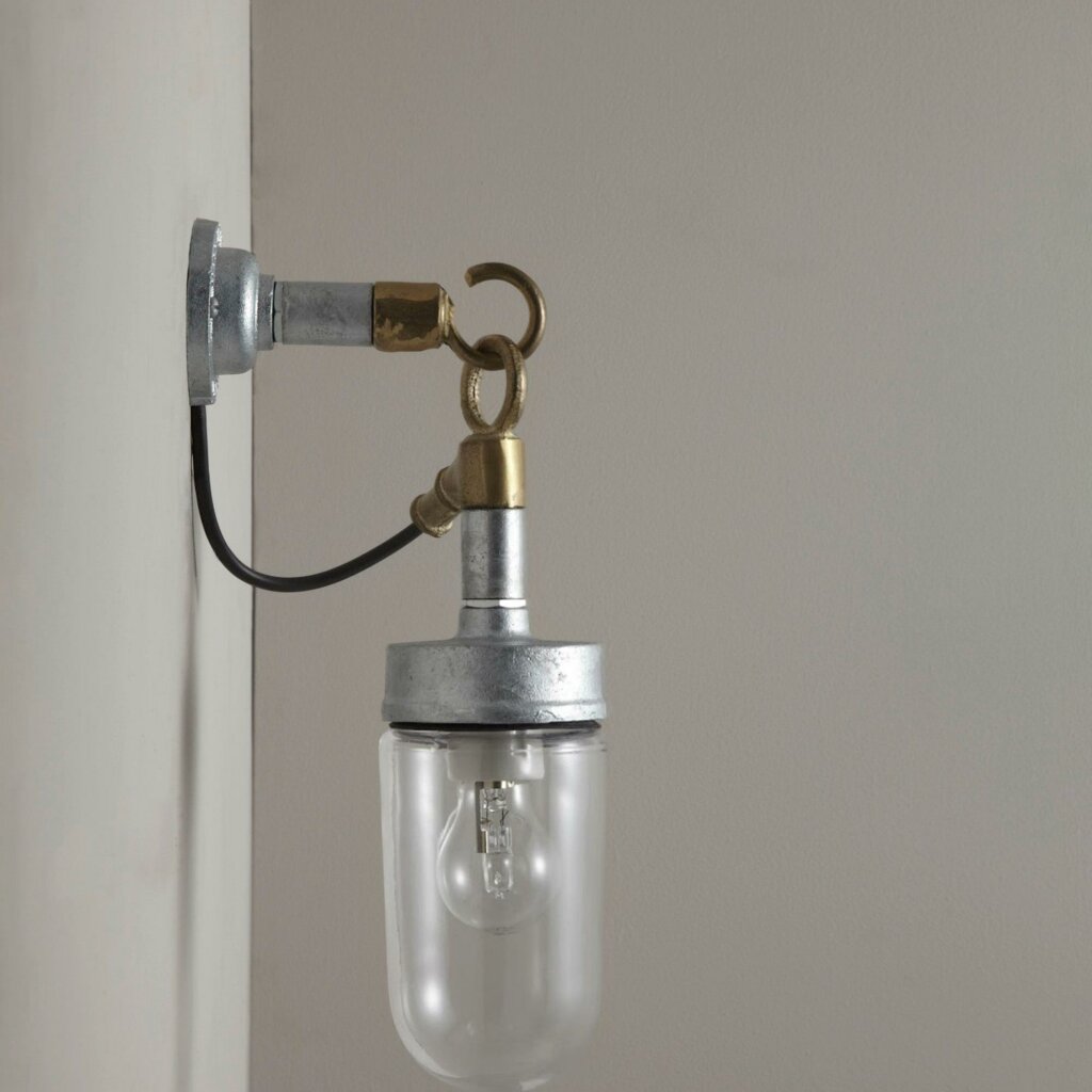 The 7679 Well Glass Wall Light takes design inspiration from the 7679 Pendant. An Industrial style well glass light, suited for both indoor and outdoor use. The light has a galvanised finish with brass suspension loop and cable entry. The light is available with clear or frosted glass.