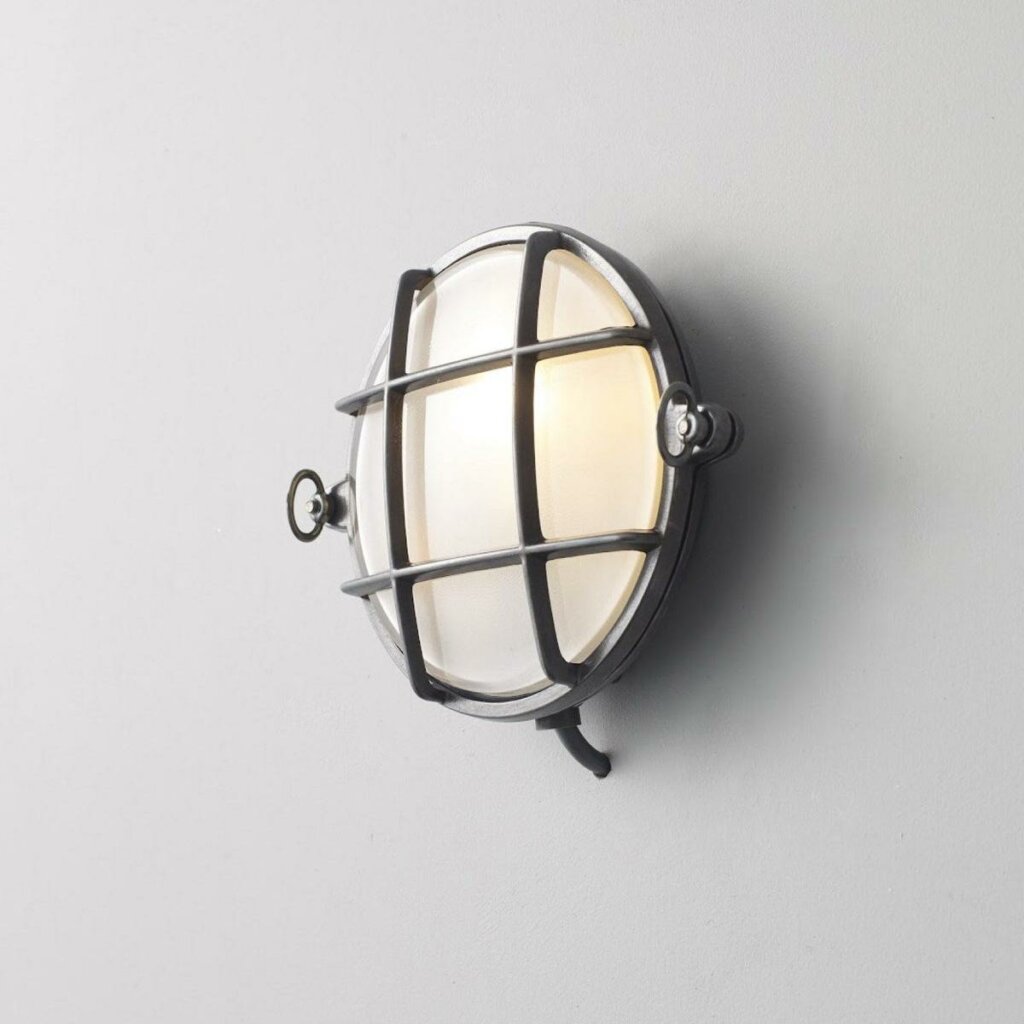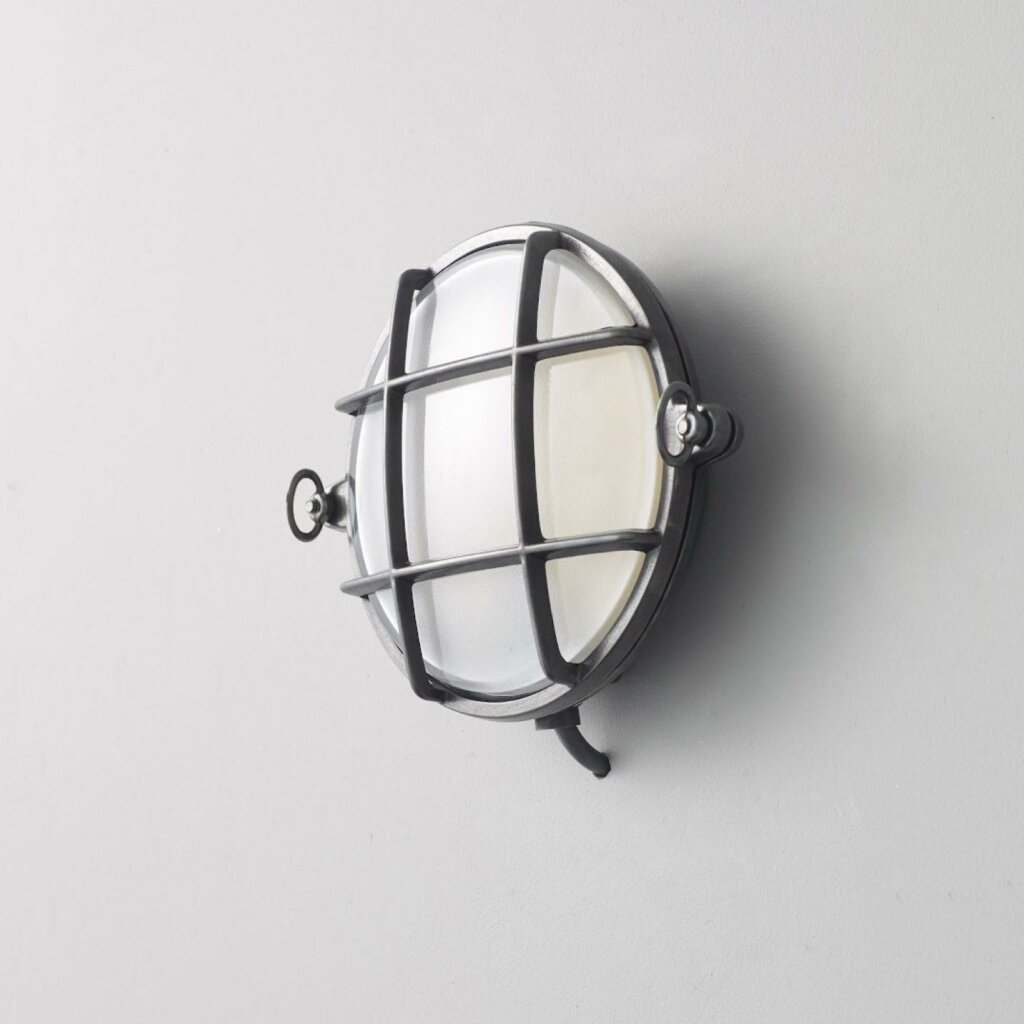A small die-cast bulkhead light in natural brass (unlacquered) and with frosted glass diffuser. Also available in weathered brass and a chrome plated finish. Front guard secured by two wing nuts, dome nuts optional by request. Glanded surface cable entry.